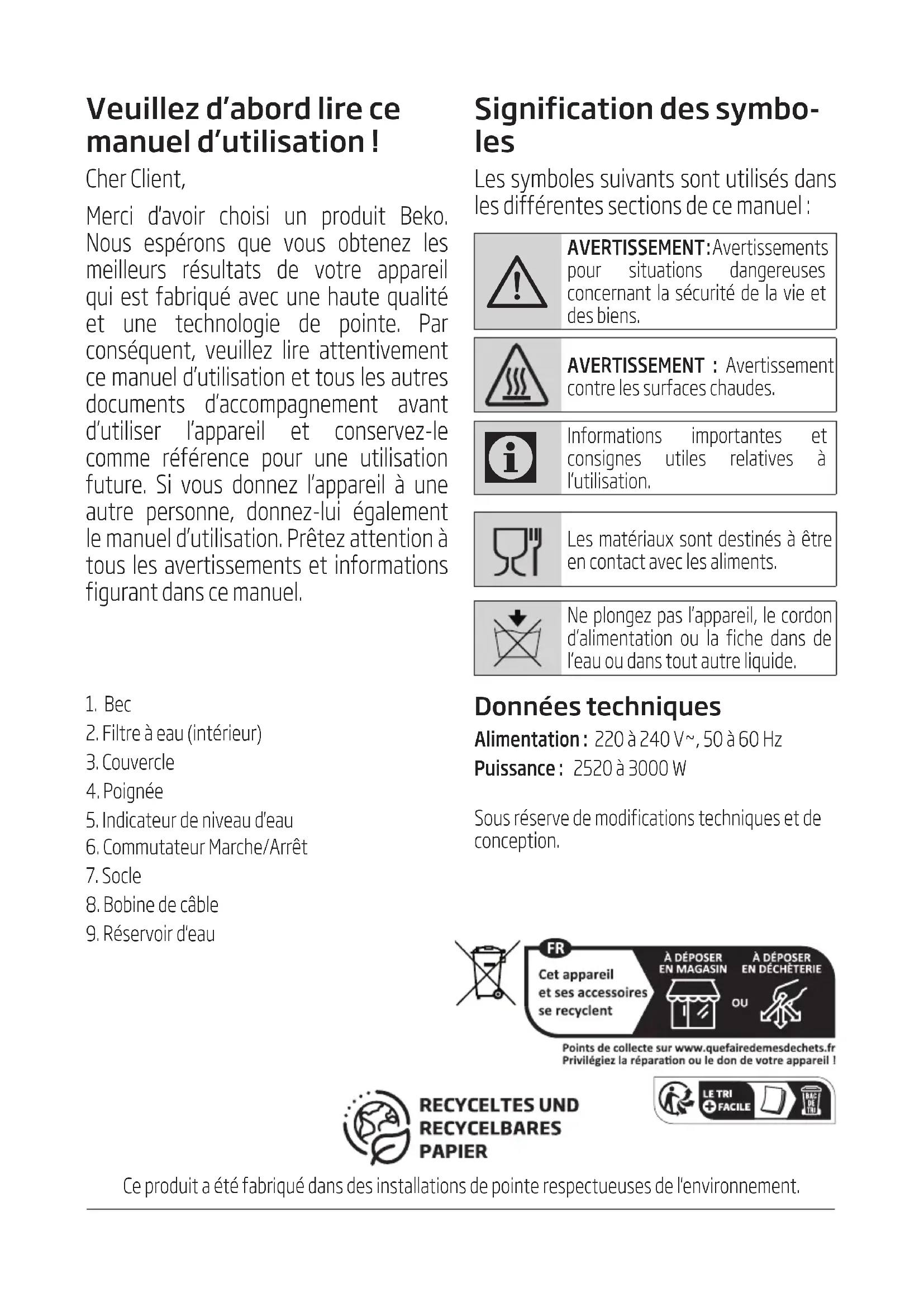 Informations importantes et consignes utiles relatives à l’utilisation. Les matériaux sont destinés à être en contact avec les aliments. Ne plongez pas l’appareil, le cordon d’alimentation ou la fiche dans de l’eau ou dans tout autre liquide. Ce produt a été fabrqué dans des nstallatons de ponte respectueuses de l'envronnement.13/ FR Bouilloire / Manuel d’utilisation Cette section comprend les instructions de sécurité qui vous protègent de toute blessure physique ou de tout dommage matériel. Le non-respect de ces instructions annule la garantie accordée.