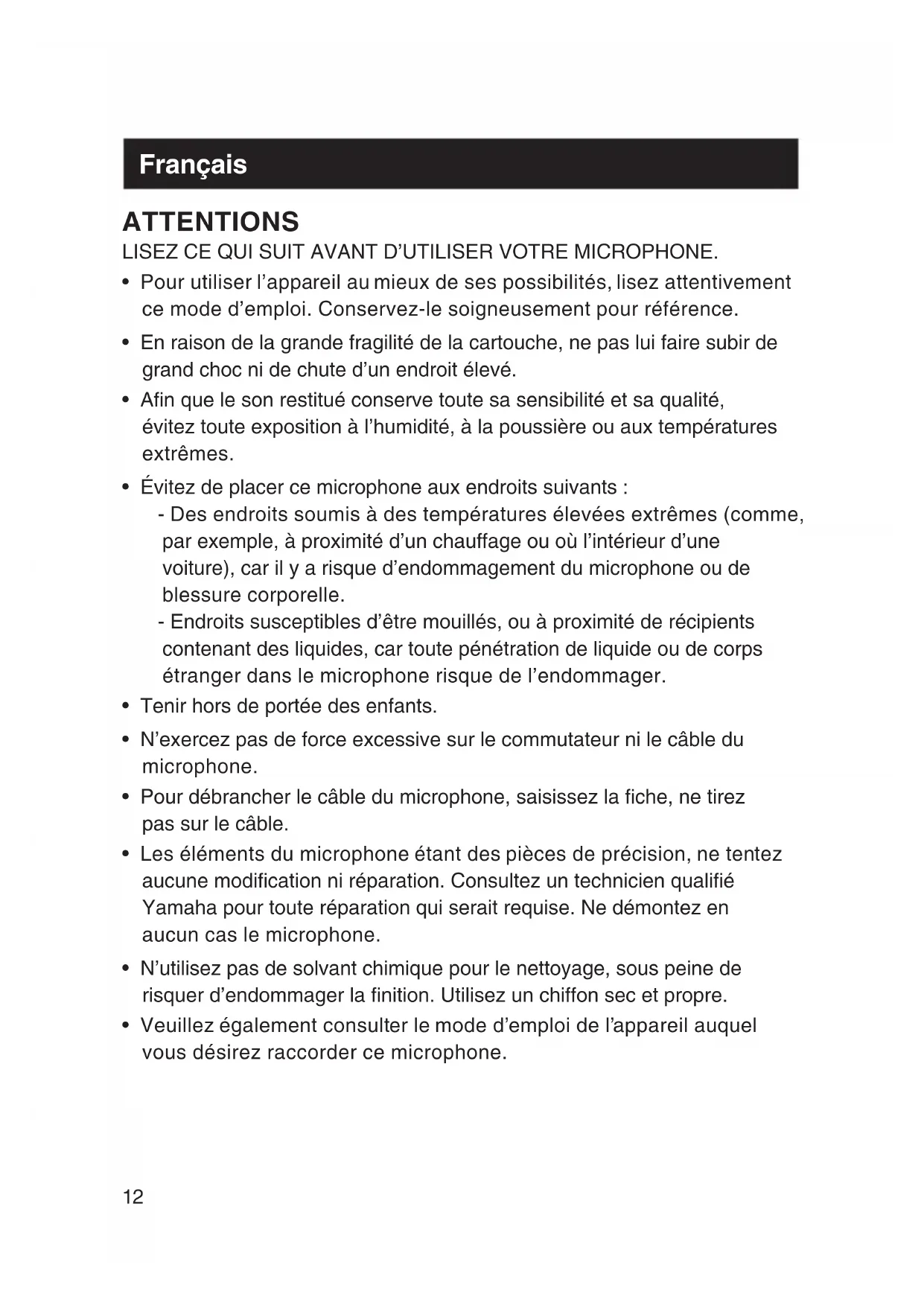 - Les éléments du microphone étant des pièces de précision, ne tentez aucune modication ni réparation. Consultez un technicien qualié Yamaha pour toute réparation qui serait requise. Ne démontez en aucun cas le microphone.