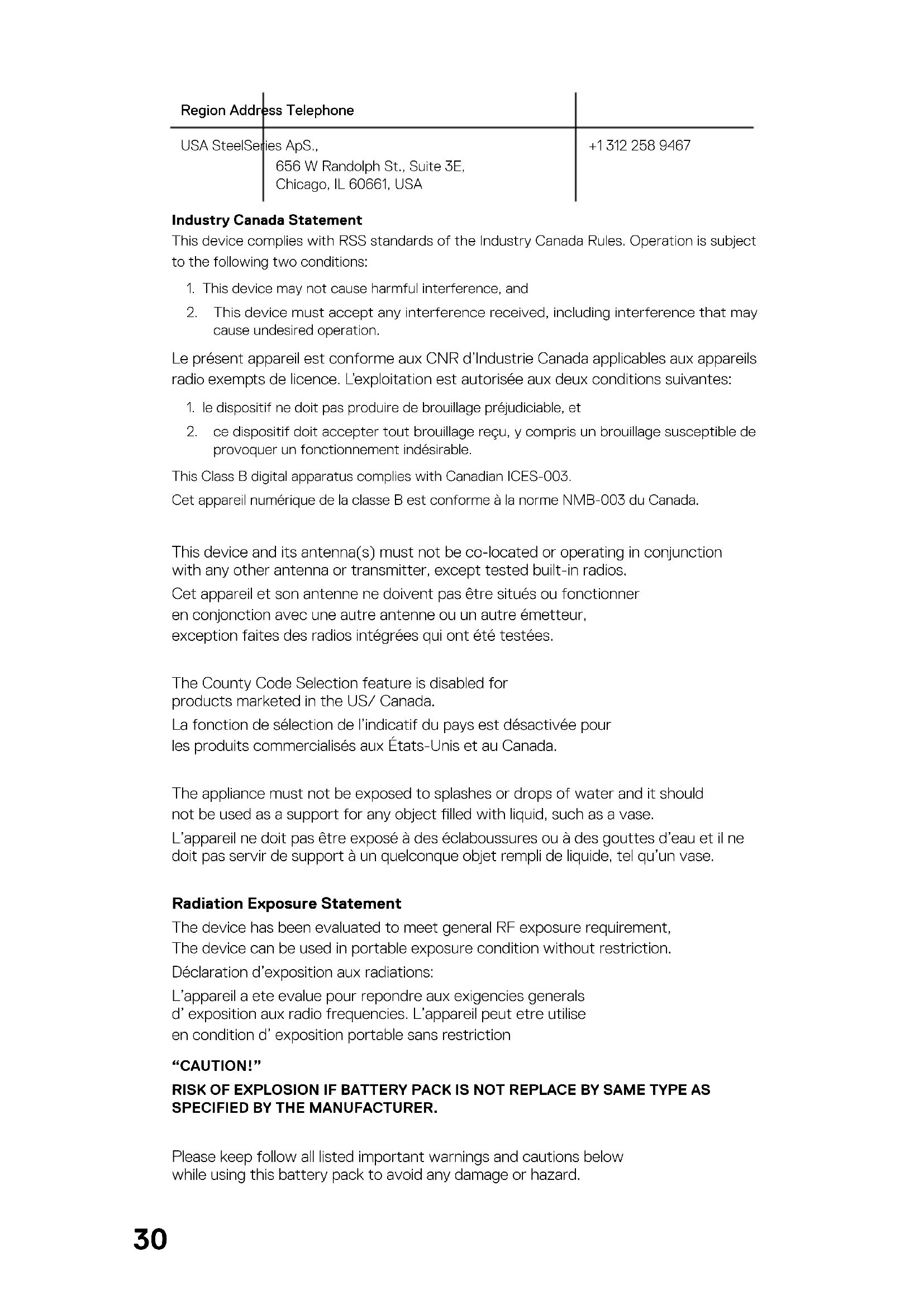 ce dispositif doit accepter tout brouillage reçu, y compris un brouillage susceptible de provoquer un fonctionnement indésirable. This Class B digital apparatus complies with Canadian ICES-003. Cet appareil numérique de la classe B est conforme à la norme NMB-003 du Canada. This device and its antenna(s) must not be co-located or operating in conjunction with any other antenna or transmitter, except tested built-in radios. Cet appareil et son antenne ne doivent pas être situés ou fonctionner en conjonction avec une autre antenne ou un autre émetteur, exception faites des radios intégrées qui ont été testées. The County Code Selection feature is disabled for products marketed in the US/ Canada. La fonction de sélection de l’indicatif du pays est désactivée pour les produits commercialisés aux États-Unis et au Canada. The appliance must not be exposed to splashes or drops of water and it should not be used as a support for any object lled with liquid, such as a vase. L’appareil ne doit pas être exposé à des éclaboussures ou à des gouttes d’eau et il ne doit pas servir de support à un quelconque objet rempli de liquide, tel qu’un vase. Radiation Exposure Statement The device has been evaluated to meet general RF exposure requirement, The device can be used in portable exposure condition without restriction. Déclaration d’exposition aux radiations: L’appareil a ete evalue pour repondre aux exigencies generals d’ exposition aux radio frequencies. L’appareil peut etre utilise en condition d’ exposition portable sans restriction “CAUTION!” RISK OF EXPLOSION IF BATTERY PACK IS NOT REPLACE BY SAME TYPE AS SPECIFIED BY THE MANUFACTURER. Please keep follow all listed important warnings and cautions below while using this battery pack to avoid any damage or hazard.31