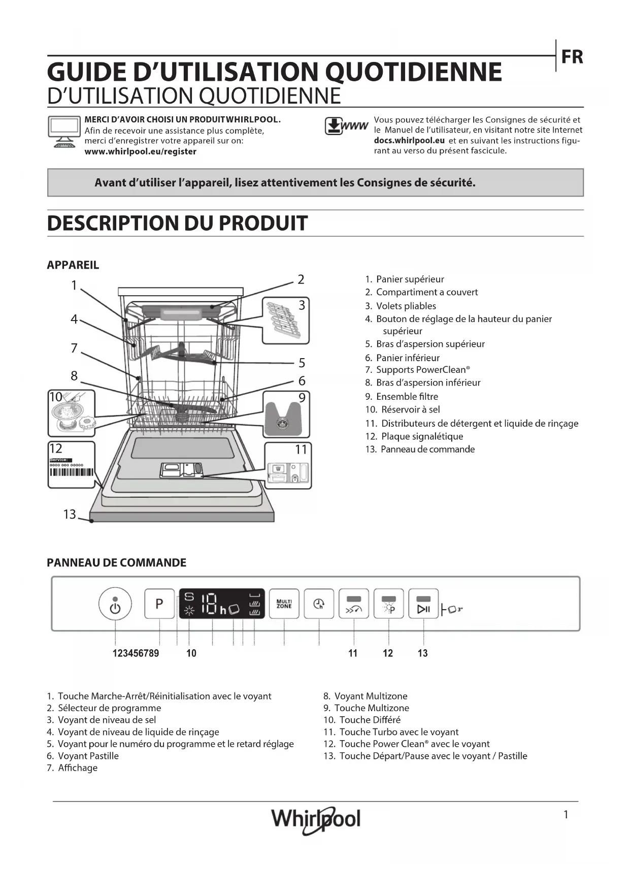 APPAREILPANNEAU DE COMMANDEMERCI D’AVOIR CHOISI UN PRODUIT WHIRLPOOL Afin de recevoir une assistance plus complète, merci d’enregistrer votre appareil sur on: www.whirlpool.eu/registerVous pouvez télécharger les Consignes de sécurité et le Manuel de l’utilisateur, en visitant notre site Internet docs.whirlpool.eu et en suivant les instructions figu-rant au verso du présent fascicule.1. Panier supérieur2. Compartiment a couvert3. Volets pliables4. Bouton de réglage de la hauteur du panier supérieur5. Bras d’aspersion supérieur6. Panier inférieur7. Supports PowerClean®8. Bras d’aspersion inférieur9. Ensemble ltre10. Réservoir à sel11. Distributeurs de détergent et liquide de rinçage12. Plaque signalétique13. Panneau de commande1. Touche Marche-Arrêt/Réinitialisation avec le voyant2. Sélecteur de programme3. Voyant de niveau de sel4. Voyant de niveau de liquide de rinçage5. Voyant pour le numéro du programme et le retard réglage6. Voyant Pastille7. Achage8. Voyant Multizone9. Touche Multizone10. Touche Diéré11. Touche Turbo avec le voyant12. Touche Power Clean® avec le voyant13. Touche Départ/Pause avec le voyant / Pastille1 2 3 4 5 6 7 8 9 1011 12 130000 000 00000 Service: