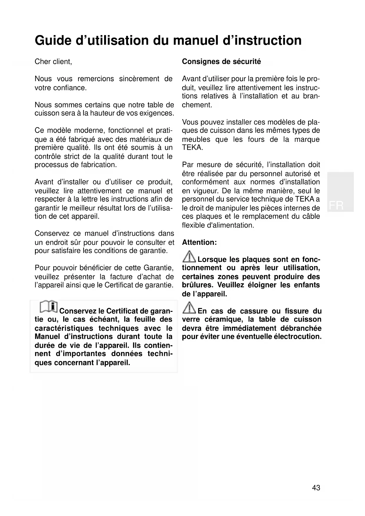 oder flüssiges Poliermittel für Elektro- Haushaltsgeräte verwenden. Tragen Sie das Produkt unverdünnt auf, lassen Sie es einwirken und wischen Sie es mit einem trockenen Tuch ab. Verwenden Sie keine Stahl-Scheuerschwämme oder harten Kunststoffschwämme. TEKA INDUSTRIAL S.A. behält sich vor, an seinen Geräten ohne Ankündigung notwen- dige Änderungen bzw. Verbes-serungen ohne Beeinträchtigung grund-legender Charakteristika vorzunehmen. Das Symbol auf dem Produkt oder seiner Verpackung weist darauf hin, dass dieses Produkt nicht als normaler Haushaltsabfall zu behandeln ist, son- dern an einem Sammelpunkt für das Recycling von elektrischen und elektro- nischen Geräten abgegeben werden muss. Durch Ihren Beitrag zum korrek- ten Entsorgen dieses Produkts schüt- zen Sie die Umwelt und die Gesundheit Ihrer Mitmenschen. Umwelt und Gesundheit werden durch falsches Entsorgen gefährdet. Weitere Informationen über das Recycling die- ses Produkts erhalten Sie von Ihrem Rathaus, Ihrer Müllabfuhr oder dem Geschäft, in dem Sie das Produkt gekauft haben.43 Cher client, Nous vous remercions sincèrement de votre confiance. Nous sommes certains que notre table de cuisson sera à la hauteur de vos exigences. Ce modèle moderne, fonctionnel et prati- que a été fabriqué avec des matériaux de première qualité. Ils ont été soumis à un contrôle strict de la qualité durant tout le processus de fabrication. Avant d’installer ou d’utiliser ce produit, veuillez lire attentivement ce manuel et respecter à la lettre les instructions afin de garantir le meilleur résultat lors de l’utilisa- tion de cet appareil. Conservez ce manuel d’instructions dans un endroit sûr pour pouvoir le consulter et pour satisfaire les conditions de garantie. Pour pouvoir bénéficier de cette Garantie, veuillez présenter la facture d’achat de l’appareil ainsi que le Certificat de garantie. Conservez le Certificat de garan- tie ou, le cas échéant, la feuille des caractéristiques techniques avec le Manuel d’instructions durant toute la durée de vie de l’appareil. Ils contien- nent d’importantes données techni- ques concernant l’appareil. Consignes de sécurité Avant d’utiliser pour la première fois le pro- duit, veuillez lire attentivement les instruc- tions relatives à l’installation et au bran- chement. Vous pouvez installer ces modèles de pla- ques de cuisson dans les mêmes types de meubles que les fours de la marque TEKA. Par mesure de sécurité, l’installation doit être réalisée par du personnel autorisé et conformément aux normes d’installation en vigueur. De la même manière, seul le personnel du service technique de TEKA a le droit de manipuler les pièces internes de ces plaques et le remplacement du câble flexible d'alimentation. Attention: Lorsque les plaques sont en fonc- tionnement ou après leur utilisation, certaines zones peuvent produire des brûlures. Veuillez éloigner les enfants de l’appareil. En cas de cassure ou fissure du verre céramique, la table de cuisson devra être immédiatement débranchée pour éviter une éventuelle électrocution. Guide d’utilisation du manuel d’instruction FR44