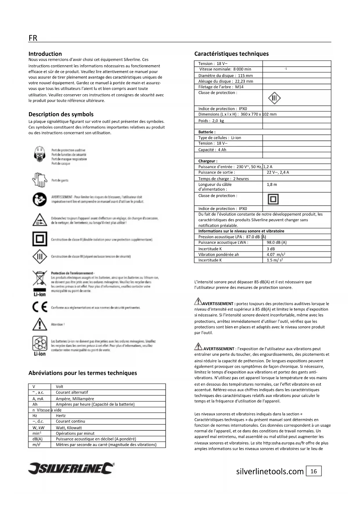 Diamètre du disque : 115 mm Alésage du disque : 22,23 mm Filetage de l’arbre : M14 Classe de protection : Indice de protection : IPX0 Dimensions (L x l x H) : 360 x 770 x 102 mm Poids : 2,0 kg Batterie : Type de cellules : Li-ion Tension : 18 V⎓ Capacité : 4 Ah Chargeur : Puissance d’entrée : 230 V~, 50 Hz, 1,2 A Puissance de sortie : 22 V⎓, 2,4 A Temps de charge : 2 heures Longueur du câble d’alimentation : 1,8 m Classe de protection : Indice de protection : IPX0 Du fait de l’évolution constante de notre développement produit, les caractéristiques des produits Silverline peuvent changer sans notification préalable. Informations sur le niveau sonore et vibratoire Pression acoustique LPA : 87.0 dB (A) Puissance acoustique LWA : 98.0 dB (A) Incertitude K 3 dB Vibration pondérée ah 4.07 m/s