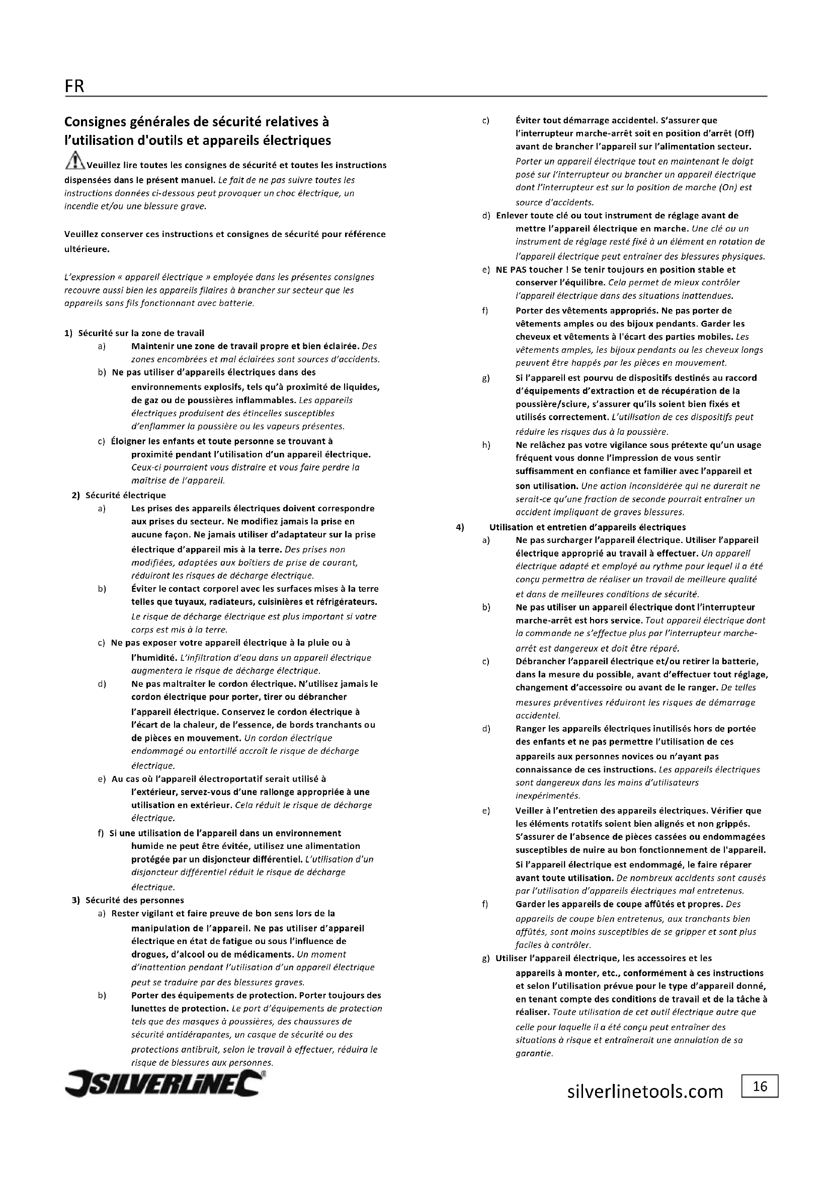 a) Ne*pas*surcharger*l’appareil*électrique.*Utiliser*l’appareil* électrique*approprié*au*travail*à*effectuer.!Un!appareil! électrique!adapté!et!employé!au!rythme!pour!lequel!il!a!été! conçu!permettra!de!réaliser!un!travail!de!meilleure!qualité! et!dans!de!meilleures!conditions!de!sécurité.# b) Ne*pas*utiliser*un*appareil*électrique*dont*l’interrupteur* marche-arrêt*est*hors*service.!Tout!appareil!électrique!dont! la!com mande !n e !s’e ffe c tu e !p lu s !p a r!l’in t er ru p t eur!marc h e- arrêt!est!dangereux!et!doit!être!réparé.# c) Débrancher*l’appareil*électrique*et/ou*retirer*la*batterie,* dans*la*mesure*du*possible,*avant*d’effectuer*tout*réglage,* changement*d’accessoire*ou*avant*de*le*ranger.!De!telles! mesures!préventives!réduiront!les!risques!de!démarrage! accidentel.# d) Ranger*les*appareils*électriques*inutilisés*hors*de*portée* des*enfants*et*ne*pas*permettre*l’utilisation*de*ces* appareils*aux*personnes*novices*ou*n’ayant*pas* connaissance*de*ces*instructions.!Les!appareils!électriques! sont!dangereux!dans!les!mains!d’utilisateurs! inexpé rimentés .# e) Veiller*à*l’entretien*des*appareils*électriques.*Vérifier*que* les*éléments*r o ta t ifs *so ie nt*bien*a lig n é s *e t*n o n *g r ip p é s .* S’assurer*de*l’absence*de*pièces*cassées*ou*endommagées* susceptibles*de*nuire*au*bon*fonctionne m ent*de*l'appare il.* Si*l’appareil*électrique*est*endommagé,*le*faire*réparer* avant*toute*utilisation.!De!nombreux!accidents!sont!causés! par!l’utilisation!d’appareils!électriques!mal!entretenus.# f) Garder*les*appareils*de*coupe*affûtés*et*propres.!Des! appareils!de!coupe!bien!entretenus,!aux!tranchants!bien! affûtés,!sont!moins!susceptibles!de!se!gripper!et!sont!plus! faciles!à!contrô ler.# g) Utiliser*l’appareil*électrique,*les*accessoires*et*les* appareils*à*monter,*etc.,*conformément*à*ces*instructions* et*selon*l’utilisation*prévue*pour*le*type*d’appareil*donné,* en*tenant*compte*des*conditions*de*travail*et*de*la*tâche*à* réaliser.!Toute!utilisation!de!cet!outil!électrique!autre!que! celle!pour!laquelle!il!a!été!con ç u !p e u t!e n tr a în e r!d e s! situations!à!risque!et!entraînerait!une!annulation!de!sa! garantie.#FR# silverlinetools.com# 17# h) Veillez*à*ce*que*les*poignées*et*toute*surface*de* préhension*de*l’appareil*soient*toujours*propres,*sèches*et exemptes*d’huile*et*de*graisse.!Une!poignée!ou!une!surface! de!préhension!rendue!glissante!ne!consentirait!pas!à! l’utilisateur!de!con s er v er !u n e !p a rfa it e !maîtrise!de !s o n ! appareil!en!toutes!circonstances.#