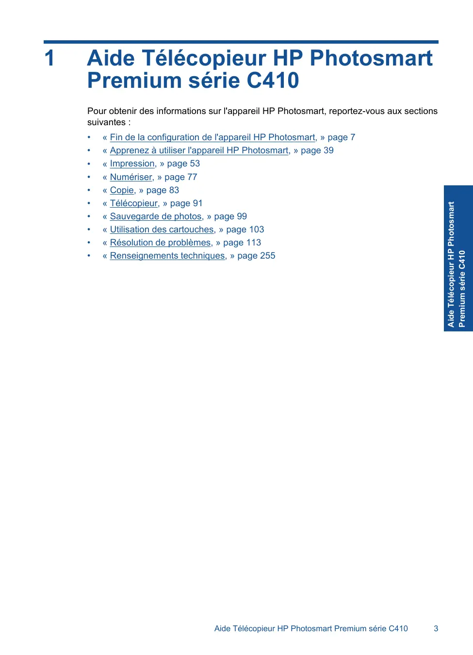 « Fin de la configuration de l'appareil HP Photosmart, » page 7 « Apprenez à utiliser l'appareil HP Photosmart, » page 39 « Impression, » page 53 « Numériser, » page 77 « Copie, » page 83 « Télécopieur, » page 91 « Sauvegarde de photos, » page 99 « Utilisation des cartouches, » page 103 « Résolution de problèmes, » page 113 « Renseignements techniques, » page 255 Aide Télécopieur HP Photosmart Premium série C410 Aide Télécopieur HP Photosmart Premium série C410