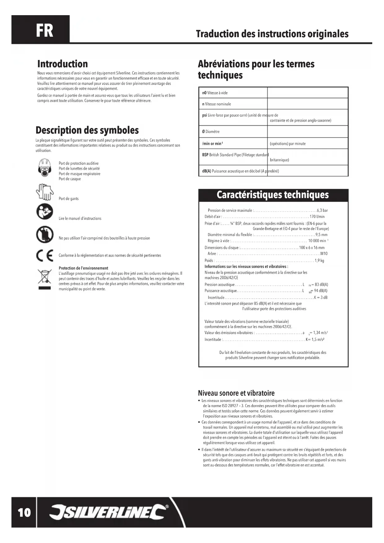 Dimensions du disque :..................................100 x 6 x 16 mm Arbre : ...........................................................M10 Poids : .........................................................1,9 kg Informations sur les niveaux sonores et vibratoires : Niveau de la pression acoustique conformément à la directive sur les machines 2006/42/CE Pression acoustique .......................................L = 83 dB(A) Puissance acoustique......................................L = 94 dB(A) Incertitude....................................................K = 3 dB L’intensité sonore peut dépasser 85 dB(A) et il est nécessaire que l’utilisateur porte des protections auditives Valeur totale des vibrations (somme vectorielle triaxiale) conformément à la directive sur les machines 2006/42/CE. Valeur des émissions vibratoires : ...........................a = 1,34 m/s Incertitude :................................................K= 1,5 m/s²Du fait de l’évolution constante de nos produits, les caractéristiques des produitsSilverlinepeuventchangersansnoticationpréalable. Introduction Nous vous remercions d’avoir choisi cet équipement Silverline. Ces instructions contiennent les informationsnécessairespourvousengarantirunfonctionnementefcaceetentoutesécurité.Veuillez lire attentivement ce manuel pour vous assurer de tirer pleinement avantage des caractéristiques uniques de votre nouvel équipement. Gardez ce manuel à portée de main et assurez-vous que tous les utilisateurs l’aient lu et bien compris avant toute utilisation. Conservez-le pour toute référence ultérieure. Traduction des instructions originales Caractéristiques techniques 196512_Manual.indd 10 30/08/2017 17:20Meuleuse d'angle pneumatique196512