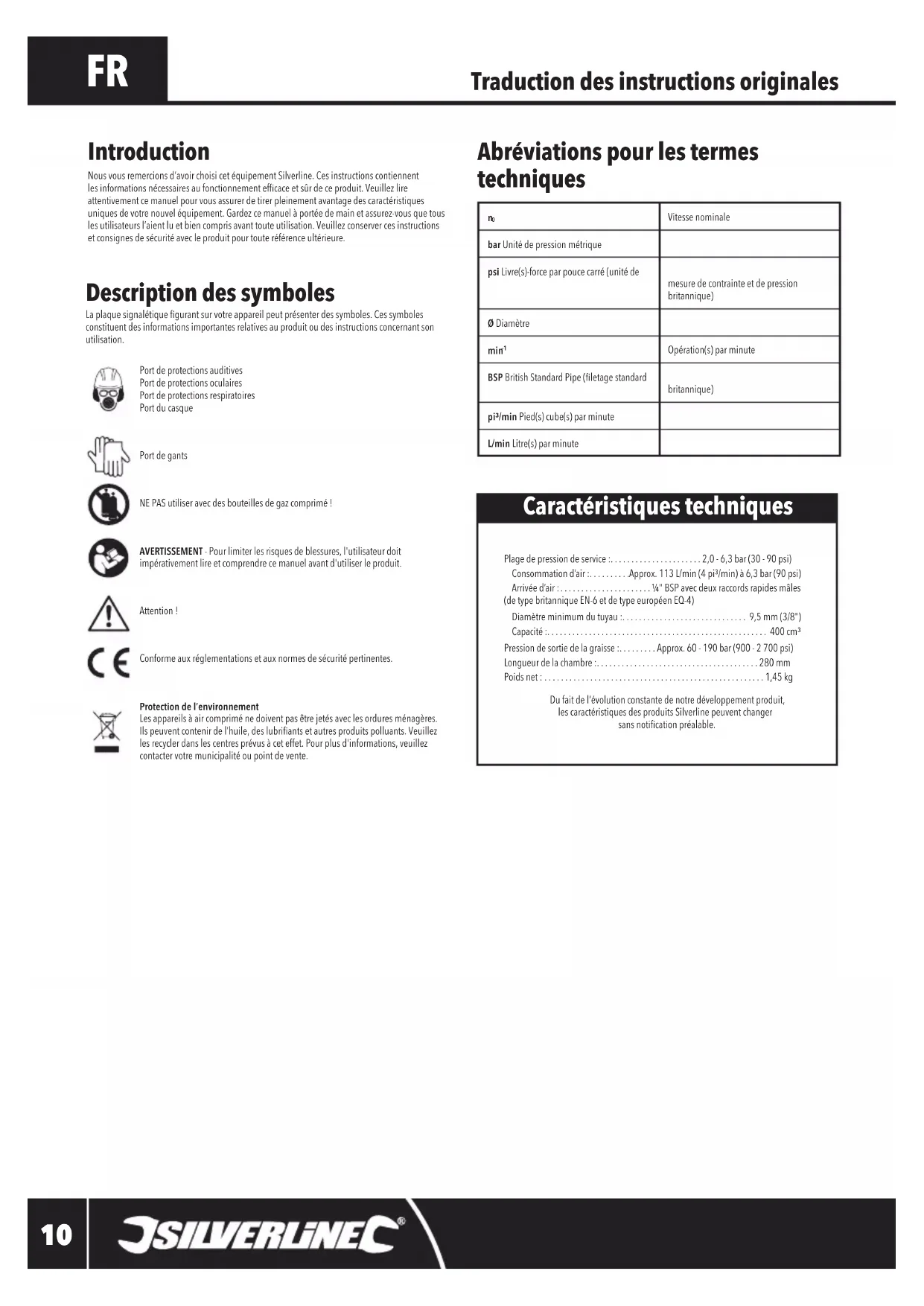 Plage de pression de service :......................2,0 - 6,3 bar (30 - 90 psi) Consommation d’air :..........Approx. 113 L/min (4 pi³/min) à 6,3 bar (90 psi) Arrivée d’air :......................¼" BSP avec deux raccords rapides mâles (de type britannique EN-6 et de type européen EQ-4) Diamètre minimum du tuyau :.............................. 9,5 mm (3/8") Capacité :..................................................... 400 cm³ Pression de sortie de la graisse :.........Approx. 60 - 190 bar (900 - 2 700 psi) Longueur de la chambre :.......................................280 mm Poids net : .....................................................1,45 kgDu fait de l’évolution constante de notre développement produit, les caractéristiques des produits Silverline peuvent changer sansnoticationpréalable. Introduction Nous vous remercions d’avoir choisi cet équipement Silverline. Ces instructions contiennent lesinformationsnécessairesaufonctionnementefcaceetsûrdeceproduit.Veuillezlireattentivement ce manuel pour vous assurer de tirer pleinement avantage des caractéristiques uniques de votre nouvel équipement. Gardez ce manuel à portée de main et assurez-vous que tous les utilisateurs l’aient lu et bien compris avant toute utilisation. Veuillez conserver ces instructions et consignes de sécurité avec le produit pour toute référence ultérieure. Traduction des instructions originales Caractéristiques techniques