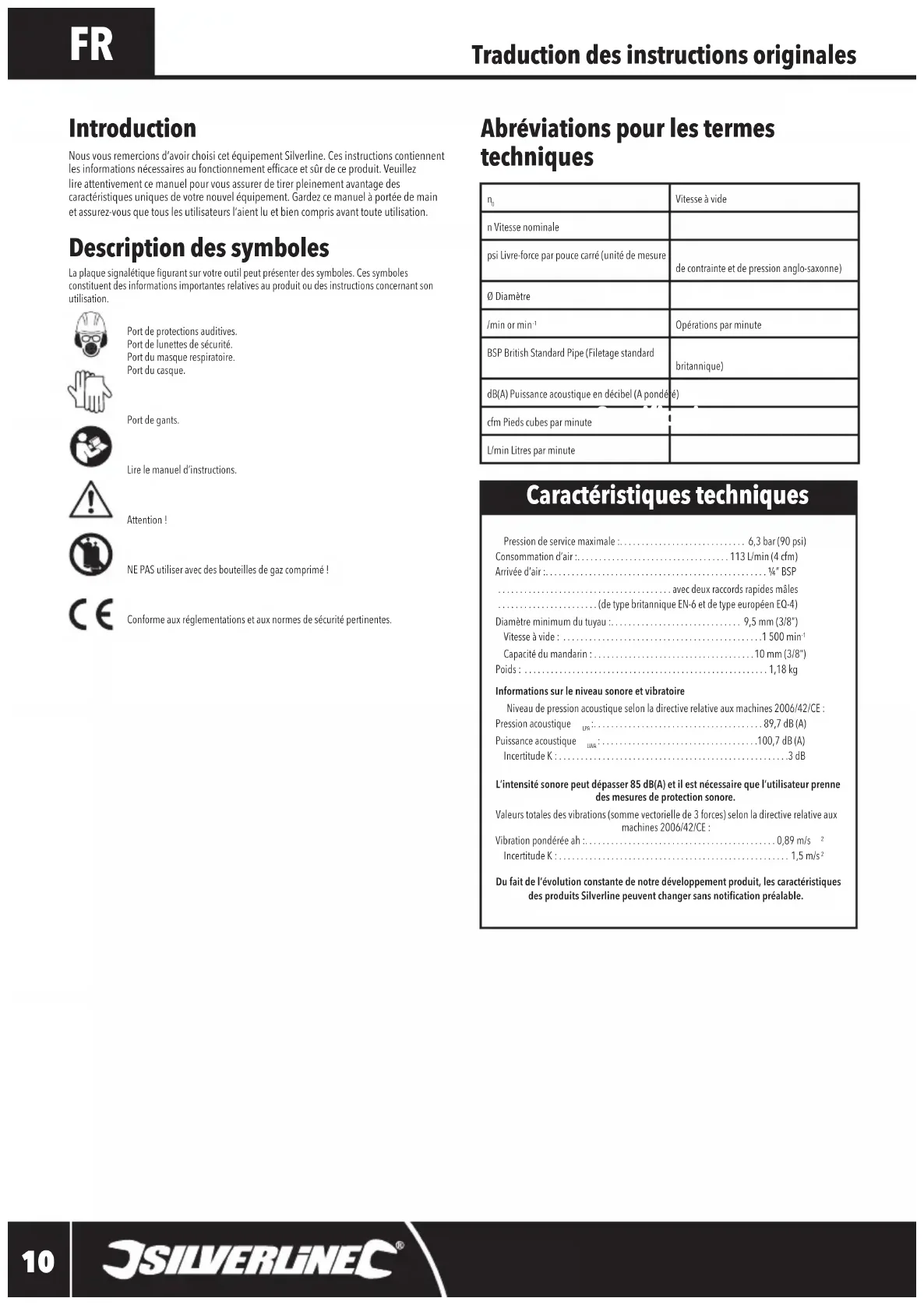 Du fait de l’évolution constante de notre développement produit, les caractéristiques des produits Silverline peuvent changer sans notication préalable. Abréviations pour les termes techniques Specication Introduction Nous vous remercions d’avoir choisi cet équipement Silverline. Ces instructions contiennent les informations nécessaires au fonctionnement efficace et sûr de ce produit. Veuillez lire attentivement ce manuel pour vous assurer de tirer pleinement avantage des caractéristiques uniques de votre nouvel équipement. Gardez ce manuel à portée de main et assurez-vous que tous les utilisateurs l’aient lu et bien compris avant toute utilisation.