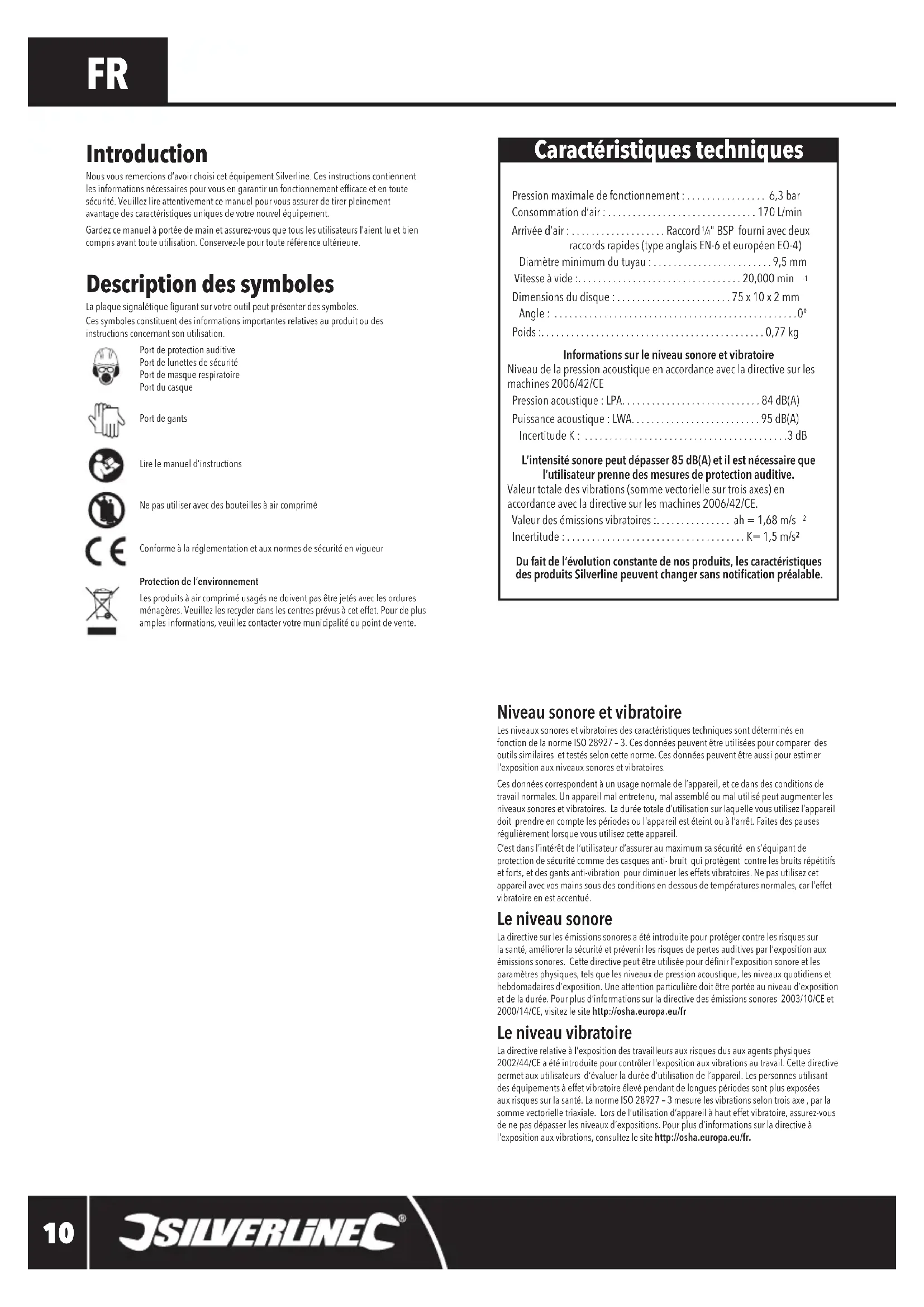 Incertitude : ....................................K= 1,5 m/s² Du fait de l’évolution constante de nos produits, les caractéristiques des produits Silverline peuvent changer sans notication préalable. Niveau sonore et vibratoire Les niveaux sonores et vibratoires des caractéristiques techniques sont déterminés en fonction de la norme ISO 28927 – 3. Ces données peuvent être utilisées pour comparer des outils similaires et testés selon cette norme. Ces données peuvent être aussi pour estimer l’exposition aux niveaux sonores et vibratoires.Ces données correspondent à un usage normale de l’appareil, et ce dans des conditions de travail normales. Un appareil mal entretenu, mal assemblé ou mal utilisé peut augmenter les niveaux sonores et vibratoires. La durée totale d’utilisation sur laquelle vous utilisez l’appareil doit prendre en compte les périodes ou l’appareil est éteint ou à l’arrêt. Faites des pauses régulièrement lorsque vous utilisez cette appareil.C’est dans l’intérêt de l’utilisateur d’assurer au maximum sa sécurité en s’équipant de protection de sécurité comme des casques anti- bruit qui protègent contre les bruits répétitifs et forts, et des gants anti-vibration pour diminuer les effets vibratoires. Ne pas utilisez cet appareil avec vos mains sous des conditions en dessous de températures normales, car l’effet vibratoire en est accentué. Le niveau sonore La directive sur les émissions sonores a été introduite pour protéger contre les risques sur la santé, améliorer la sécurité et prévenir les risques de pertes auditives par l’exposition aux émissions sonores. Cette directive peut être utilisée pour dénir l’exposition sonore et les paramètres physiques, tels que les niveaux de pression acoustique, les niveaux quotidiens et hebdomadaires d’exposition. Une attention particulière doit être portée au niveau d’exposition et de la durée. Pour plus d’informations sur la directive des émissions sonores 2003/10/CE et 2000/14/CE, visitez le site http://osha.europa.eu/fr Le niveau vibratoire La directive relative à l’exposition des travailleurs aux risques dus aux agents physiques 2002/44/CE a été introduite pour contrôler l’exposition aux vibrations au travail. Cette directive permet aux utilisateurs d’évaluer la durée d’utilisation de l’appareil. Les personnes utilisant des équipements à effet vibratoire élevé pendant de longues périodes sont plus exposées aux risques sur la santé. La norme ISO 28927 – 3 mesure les vibrations selon trois axe , par la somme vectorielle triaxiale. Lors de l’utilisation d’appareil à haut effet vibratoire, assurez-vous de ne pas dépasser les niveaux d’expositions. Pour plus d’informations sur la directive à l’exposition aux vibrations, consultez le site http://osha.europa.eu/fr. Description des symboles La plaque signalétique gurant sur votre outil peut présenter des symboles.Ces symboles constituent des informations importantes relatives au produit ou des instructions concernant son utilisation.Port de protection auditivePort de lunettes de sécuritéPort de masque respiratoirePort du casquePort de gantsLire le manuel d’instructions Ne pas utiliser avec des bouteilles à air comprimé Conforme à la réglementation et aux normes de sécurité en vigueurProtection de l’environnementLes produits à air comprimé usagés ne doivent pas être jetés avec les ordures ménagères. Veuillez les recycler dans les centres prévus à cet effet. Pour de plus amples informations, veuillez contacter votre municipalité ou point de vente. Introduction Nous vous remercions d’avoir choisi cet équipement Silverline. Ces instructions contiennent les informations nécessaires pour vous en garantir un fonctionnement efcace et en toute sécurité. Veuillez lire attentivement ce manuel pour vous assurer de tirer pleinement avantage des caractéristiques uniques de votre nouvel équipement. Gardez ce manuel à portée de main et assurez-vous que tous les utilisateurs l’aient lu et bien compris avant toute utilisation. Conservez-le pour toute référence ultérieure. 598446_Z1MANPRO1.indd 10 15/02/2017 12:40Disqueuse droite pneumatique598446