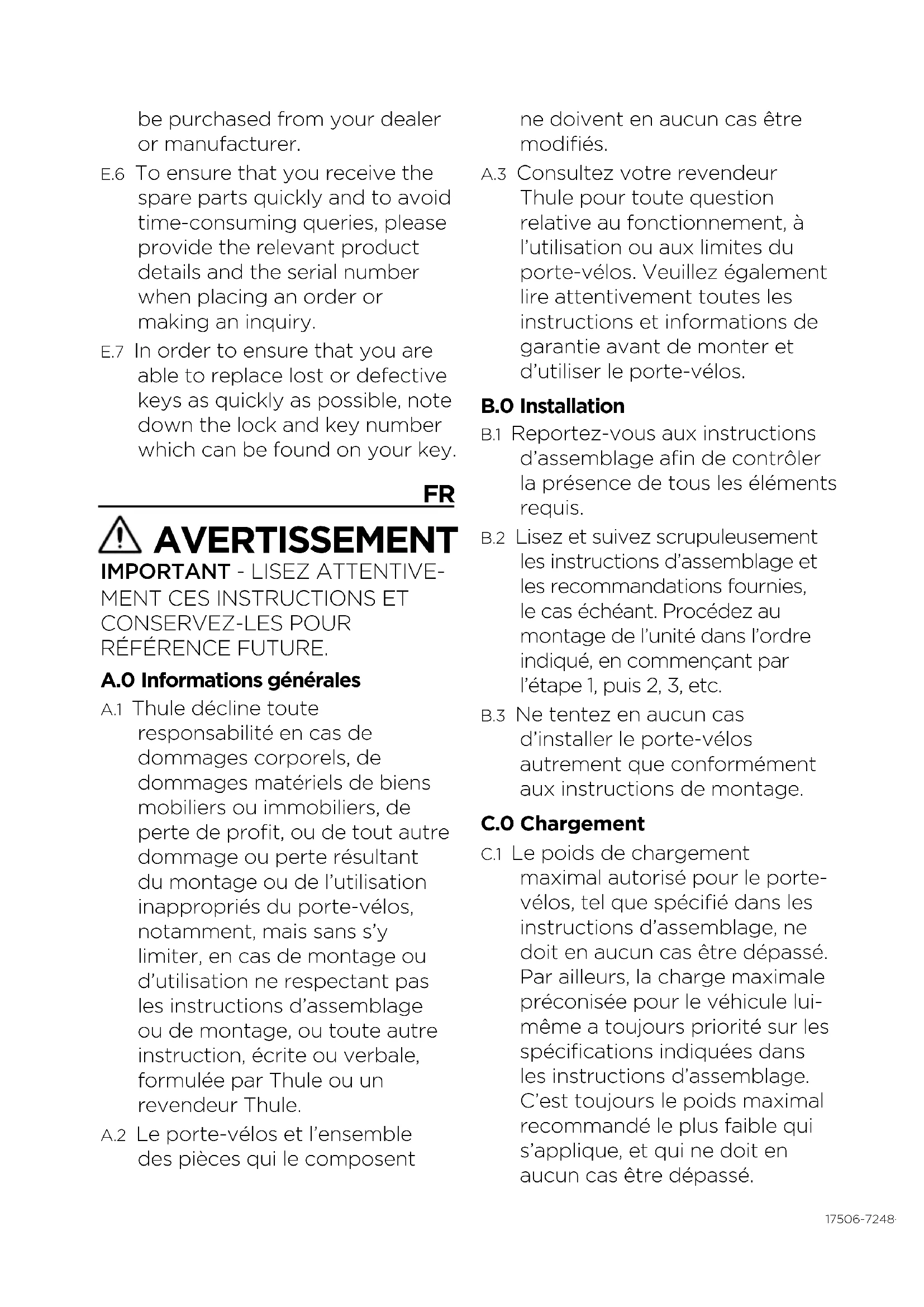 CONSERVEZ-LES POUR RÉFÉRENCE FUTURE. A.0 Informations générales A.1 Thule décline toute responsabilité en cas de dommages corporels, de dommages matériels de biens mobiliers ou immobiliers, de perte de profit, ou de tout autre dommage ou perte résultant du montage ou de l’utilisation inappropriés du porte-vélos, notamment, mais sans s’y limiter, en cas de montage ou d’utilisation ne respectant pas les instructions d’assemblage ou de montage, ou toute autre instruction, écrite ou verbale, formulée par Thule ou un revendeur Thule. A.2 Le porte-vélos et l’ensemble des pièces qui le composent ne doivent en aucun cas être modifiés. A.3 Consultez votre revendeur Thule pour toute question relative au fonctionnement, à l’utilisation ou aux limites du porte-vélos. Veuillez également lire attentivement toutes les instructions et informations de garantie avant de monter et d’utiliser le porte-vélos. B.0 Installation B.1 Reportez-vous aux instructions d’assemblage afin de contrôler la présence de tous les éléments requis. B.2 Lisez et suivez scrupuleusement les instructions d’assemblage et les recommandations fournies, le cas échéant. Procédez au montage de l’unité dans l’ordre indiqué, en commençant par l’étape 1, puis 2, 3, etc. B.3 Ne tentez en aucun cas d’installer le porte-vélos autrement que conformément aux instructions de montage. C.0 Chargement C.1 Le poids de chargement maximal autorisé pour le porte- vélos, tel que spécifié dans les instructions d’assemblage, ne doit en aucun cas être dépassé. Par ailleurs, la charge maximale préconisée pour le véhicule lui- même a toujours priorité sur les spécifications indiquées dans les instructions d’assemblage. C’est toujours le poids maximal recommandé le plus faible qui s’applique, et qui ne doit en aucun cas être dépassé.18 506-7248-04 C.2 Le poids maximal autorisé pour le porte-vélos, tel que spécifié dans les instructions d’assemblage, s’applique aux véhicules en mouvement comme à l’arrêt. C.3 Le chargement doit être correctement fixé. Notez que l’utilisation de tendeurs élastiques est strictement prohibée. C.4 Contrôlez le poids maximal autorisé par vélo indiqué dans les instructions de montage, et veillez à ne pas le dépasser. C.5 Lors du chargement de vélos sur un porte-vélos, veillez à toujours placer les vélos les plus lourds et les plus volumineux du côté le plus près de la voiture. C.6 Le porte-vélos a été conçu pour des cadres de vélo standard. N’est pas prévu pour les tandems ni les vélos à position allongée (VPA).Contrôlez la taille de cadre de vélo maximale autorisée (diamètre), telle qu’indiquée dans les instructions de montage, et veillez à ne pas la dépasser. C.7 Pour les vélos dotés d’un cadre ou de fourches en carbone, consultez le fabricant ou le revendeur du vélo pour vous assurer de l’utilisation possible du porte-vélos. C.8 Thule décline toute responsabilité quant à l’endommagement de cadres ou de fourches en carbone survenant lors du montage et/ ou de l’utilisation du porte-vélos. C.9 Tous les éléments pouvant être facilement démontés doivent être retirés du vélo avant le transport, notamment toute housse pour vélo, le siège enfant, panier, antivol (non fixes) ou pompe à air. Cette liste est non exhaustive. Ces éléments pourraient en eet se détacher lors du transport en raison de l’augmentation des vibrations et de la résistance à l’air, et constituer un danger pour les autres usagers de la route. C.10 Si le véhicule est équipé d’une fonction d’ouverture automatique du core ou du hayon arrière, celle-ci doit impérativement être désactivée : le compartiment à bagages doit être ouvert manuellement en cas d’utilisation d’un porte- vélos sur hayon arrière, afin de ne pas endommager le véhicule et/ou le porte-vélos. C.11 Si nécessaire, le chargement doit être complété avec les feux et signes d’avertissement appropriés, conformément à la législation locale en vigueur. C.12 Conservez les instructions de montage ainsi que les consignes de sécurité et, le cas échéant, l’attestation CE de type dans le véhicule recevant le porte-vélos. C.13 Ne l’installez pas sur une remorque ou un véhicule remorqué. D.0 Réglementation et caractéristiques de conduite D.1 Ce produit est destiné à être utilisé sur des routes publiques et privées, y compris19506-7248-04 sur des chemins de terre et routes forestières. Tout autre usage et conduite hors route relève de la responsabilité de l’utilisateur et n’est pas couvert par la garantie. Adaptez votre vitesse aux conditions routières prédominantes et à la charge transportée. Vérifiez régulièrement la fixation de la charge. D.2 Il est de la seule responsabilité du conducteur de s’assurer du bon état du porte-vélos ainsi que de la bonne fixation de l’ensemble porte-vélos/ chargement (même lorsque l’ensemble est installé par un tiers). D.3 Lors de chaque utilisation du porte-vélos, vérifiez qu’il est correctement installé après avoir parcouru une courte distance 31 mi (50 km), puis à intervalles réguliers. En cas de bruit inhabituel, de déplacement du chargement et/ou du porte-vélos, d’un comportement inhabituel du véhicule ou de tout autre détail inhabituel, arrêtez-vous afin de contrôler la fixation du porte-vélos et du chargement, conformément aux instructions de montage. D.4 L’utilisation d’un porte-vélos peut entraîner l’augmentation de la longueur et/ou de la hauteur totale du véhicule. Les vélos eux-mêmes peuvent accroître la largeur et la hauteur totale du véhicule. Soyez particulièrement vigilent lors des marches arrière et/ou lors de l’entrée dans les garages ou les ferries, entre autres. D.5 Remplacez immédiatement tout composant endommagé ou usé. Lors du transport, tous les leviers, boulons et/ ou écrous doiven