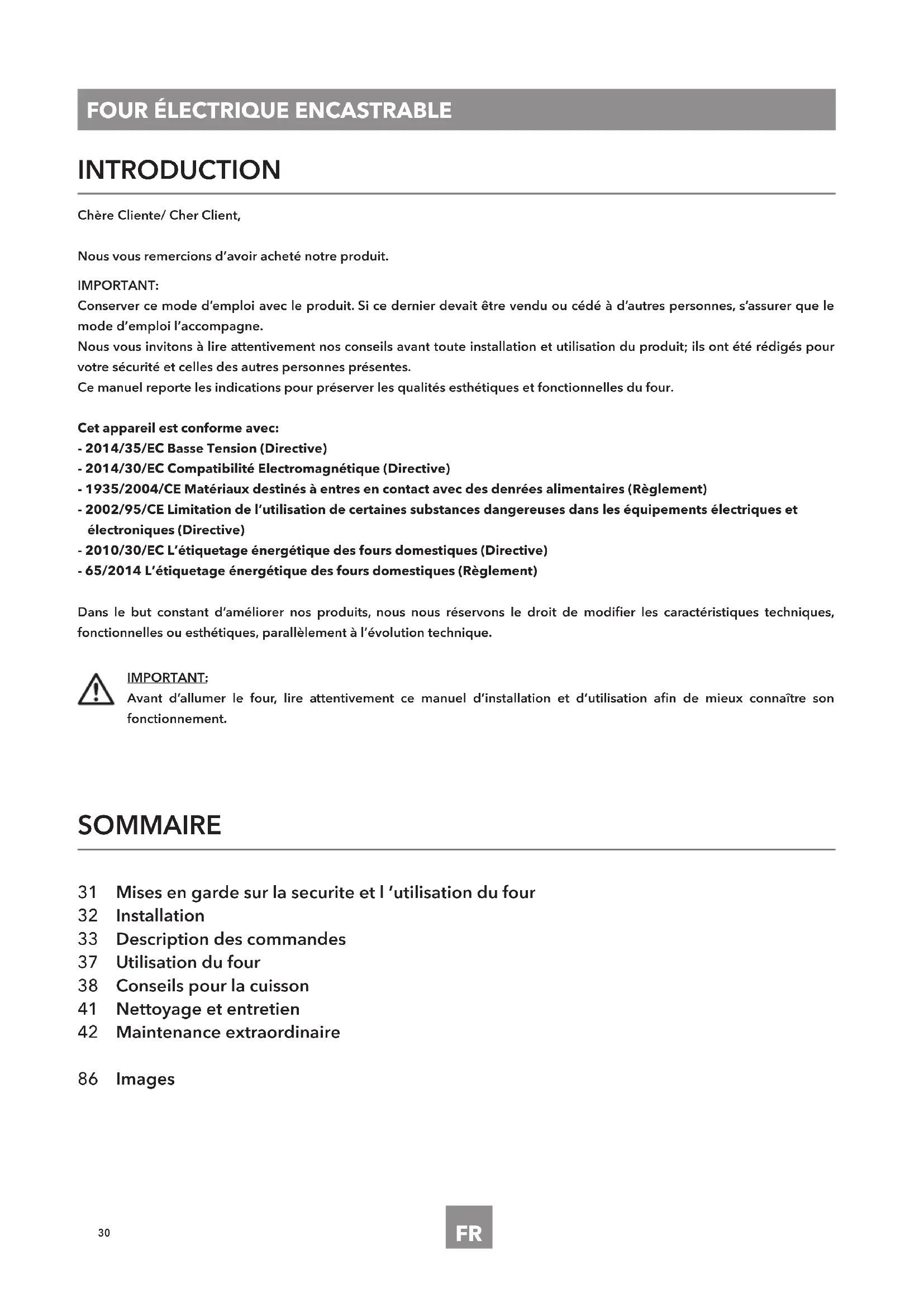SOMMAIRE 31 Mises en garde sur la securite et l ’utilisation du four 32 Installation 33 Description des commandes 37 Utilisation du four 38 Conseils pour la cuisson 41 Nettoyage et entretien 42 Maintenance extraordinaire 86 Images INTRODUCTION Chère Cliente/ Cher Client, Nous vous remercions d’avoir acheté notre produit. IMPORTANT: Conserver ce mode d’emploi avec le produit. Si ce dernier devait être vendu ou cédé à d’autres personnes, s’assurer que le mode d’emploi l’accompagne. Nous vous invitons à lire attentivement nos conseils avant toute installation et utilisation du produit; ils ont été rédigés pour votre sécurité et celles des autres personnes présentes. Ce manuel reporte les indications pour préserver les qualités esthétiques et fonctionnelles du four. Cet appareil est conforme avec: - 2014/35/EC Basse Tension (Directive) - 2014/30/EC Compatibilité Electromagnétique (Directive) - 1935/2004/CE Matériaux destinés à entres en contact avec des denrées alimentaires (Règlement) - 2002/95/CE Limitation de l’utilisation de certaines substances dangereuses dans les équipements électriques et électroniques (Directive) - 2010/30/EC L’étiquetage énergétique des fours domestiques (Directive) - 65/2014 L’étiquetage énergétique des fours domestiques (Règlement) Dans le but constant d’améliorer nos produits, nous nous réservons le droit de modier les caractéristiques techniques, fonctionnelles ou esthétiques, parallèlement à l’évolution technique. IMPORTANT: Avant d’allumer le four, lire attentivement ce manuel d’installation et d’utilisation an de mieux connaître son fonctionnement.