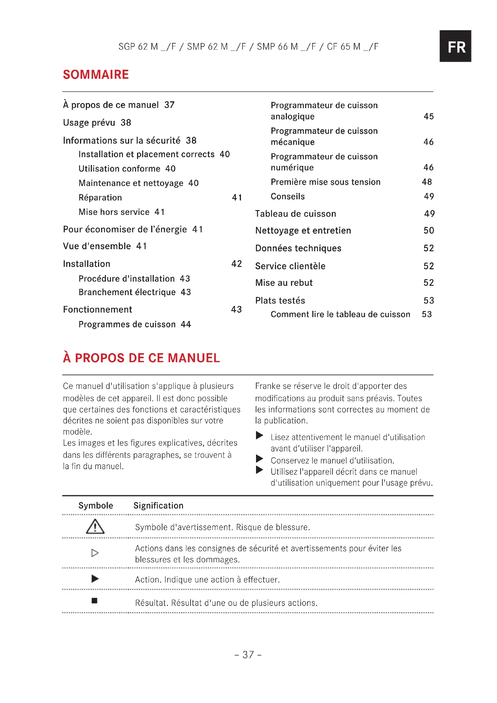 SOMMAIRE À propos de ce manuel 37 Usage prévu 38 Informations sur la sécurité 38 Installation et placement corrects 40 Utilisation conforme 40 Maintenance et nettoyage 40 Réparation 41 Mise hors service 41 Pour économiser de l’énergie 41 Vue d'ensemble 41 Installation 42 Procédure d'installation 43 Branchement électrique 43 Fonctionnement 43 Programmes de cuisson 44 Programmateur de cuisson analogique 45 Programmateur de cuisson mécanique 46 Programmateur de cuisson numérique 46 Première mise sous tension 48 Conseils 49 Tableau de cuisson 49 Nettoyage et entretien 50 Données techniques 52 Service clientèle 52 Mise au rebut 52 Plats testés 53 Comment lire le tableau de cuisson 53