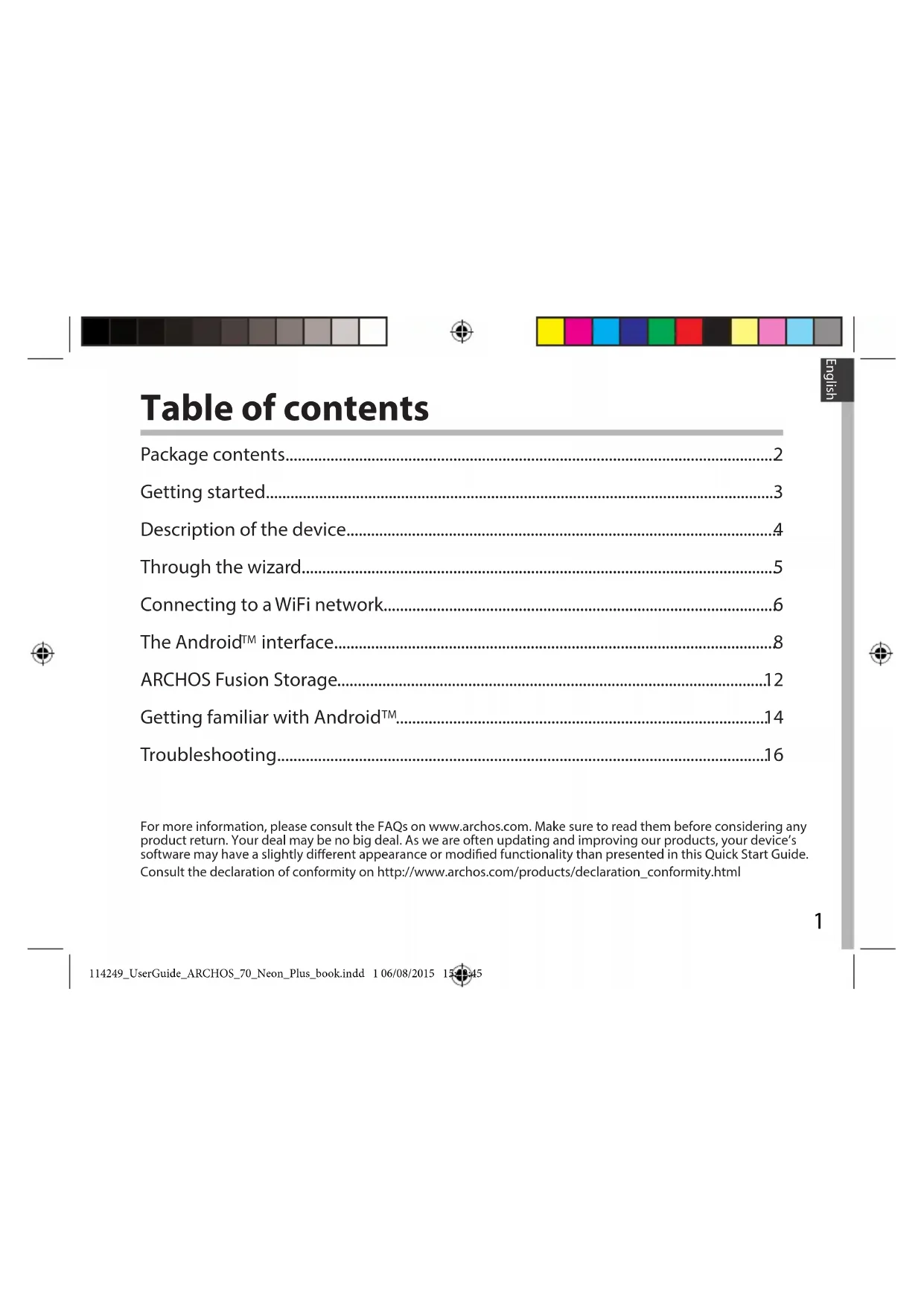 114249_UserGuide_ARCHOS_70_Neon_Plus_book.indd 17 06/08/2015 15:22:5118 Warranty Contenu de la boîte Câble USB Chargeur Guide d’utilisation rapide Guide des garanties et des mentions légales ARCHOS 70 Neon + 114249_UserGuide_ARCHOS_70_Neon_Plus_book.indd 18 06/08/2015 15:22:5119 Français Mise en route ASTUCES: Pour bénéficier d’une assistance complète, enregistrez votre produit. A partir de votre ordinateur, allez sur www.archos.com/register. Charger la batterie