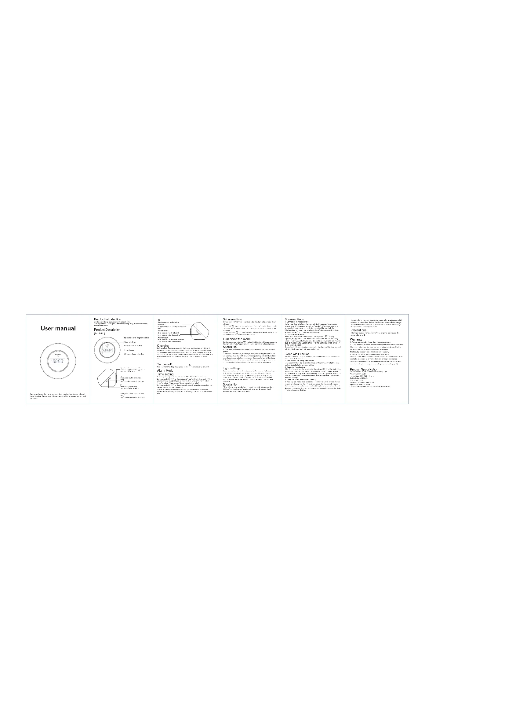 Introduction du produit Uwake est un réveil-matin avec des lumières colorées.Avec des basses superbes, et lumières à 7 couleurs. Un bruit blanc pour vous aider pendant le sommeil, une répétition humaine et bien d'autres fonctions. Description du produit [Face avant] Partie de fonctionnement et d'affichageAlarme sur l'affichageZone pratique de clé de sommeilZone d'affichage de l'horlogeAffichage de connexion Bluetooth Filet de corne: appuyer brièvement pour 0.5s sélectionner, léger / long pour éteindre appuyer brièvement sur la chanson suivante / appuyer long temps pour augmenter le volume : Touche d'alimentation / arrêt: appui bref pour lire-pause / appuyez long temps pour allumer ou éteindre Appuyer brièvement sur la dernière chanson / appuyez longuement pour baisser le volume Touche Bluetooth: appuyez brièvement pour éteindre ou reconnecter. Appuyez long temps pour régler la luminosité de la lumièreTouche horloge: appuyez brièvement pour sélectionner 12H / 24H. Appuyez long temps pour régler l'heureTouche d'alarme:appuyez brièvement pour activer ou désactiver l'alarme. Appuyez Long temps pour faire le réglage de l'alarme Chargement Avant de mettre sous tension votre appareil, veuillez brancher l'Uwake au câble de chargement et connecter l'adaptateur pour charger (l'adaptateur de chargement doit être d'au moins 5V1A ou plus). Uwake est une batterie intégrée de 1800mAh, lorsqu’elle charge avec un adaptateur DC5V 1A, elle est pleine pendant environ 3 heures (il est déconseillé de charger à travers un PC).Remarque: lorsque le produit est en charge, il sera légèrement chaud, ce qui est normal. Activer / Désactiver Lorsque vous éteignez / allumez, vous devrez appuyez longuement sur le bouton d’alimentation pendant environ 3 secondes pour l’allumer / l’éteindre.Garantie 1. La période de garantie est d’un an à compter de la date d’acquisition.2. Pendant la période de garantie, en cas de problème ou de dysfonctionne-ment de ce produit en cas d'utilisation et de maintenance normales, après vérification, nous effectuerons une réparation gratuite et le remplacement des composants.Les situations suivantes ne sont pas incluses dans la garantie:1. Les appareils, les composants sont au-delà de la période de garantie.2.Dommage causé par une utilisation anormale telle que toute utilisation, maintenance ou installation incorrecte non conforme aux exigences du manuel du produit.