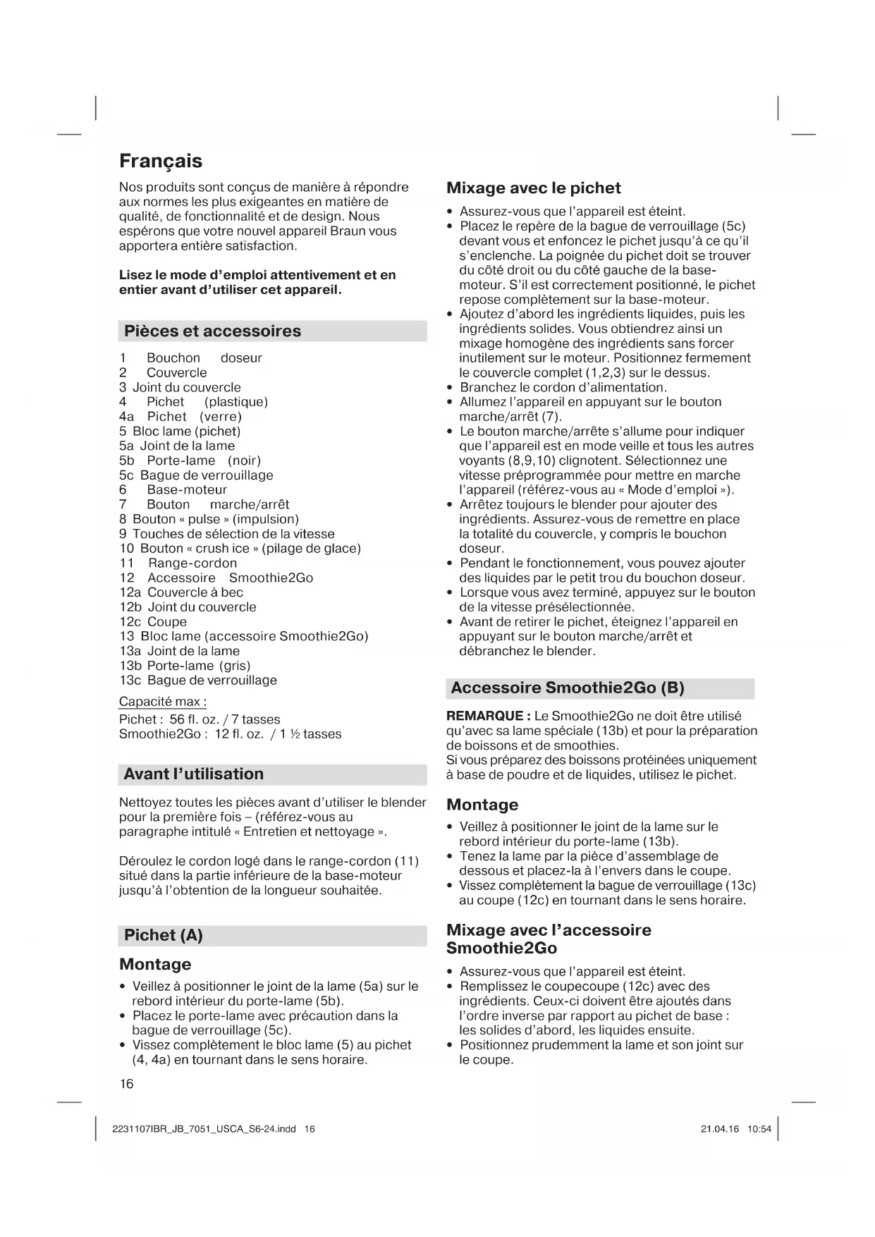- ⅛ cup almonds Place all ingredients into the cup, in the order listed. Blend on speed 5 «liquify» (max. speed) for 60 seconds. When preparing protein shakes using powder and liquids only, use the pitcher. 2231107IBR_JB_7051_USCA_S6-24.indd 152231107IBR_JB_7051_USCA_S6-24.indd 15 21.04.16 10:5421.04.16 10:5416 Français Nos produits sont conçus de manière à répondre aux normes les plus exigeantes en matière de qualité, de fonctionnalité et de design. Nous espérons que votre nouvel appareil Braun vous apportera entière satisfaction. Lisez le mode d’emploi attentivement et en entier avant d’utiliser cet appareil. Pièces et accessoires 1 Bouchon doseur 2 Couvercle 3 Joint du couvercle 4 Pichet (plastique) 4a Pichet (verre) 5 Bloc lame (pichet) 5a Joint de la lame 5b Porte-lame (noir) 5c Bague de verrouillage 6 Base-moteur 7 Bouton marche/arrêt 8 Bouton « pulse » (impulsion) 9 Touches de sélection de la vitesse 10 Bouton « crush ice » (pilage de glace) 11 Range-cordon 12 Accessoire Smoothie2Go 12a Couvercle à bec 12b Joint du couvercle 12c Coupe 13 Bloc lame (accessoire Smoothie2Go) 13a Joint de la lame 13b Porte-lame (gris) 13c Bague de verrouillage Capacité max : Pichet : 56 fl. oz. / 7 tasses Smoothie2Go : 12 fl. oz. / 1 ½ tasses Avant l’utilisation Nettoyez toutes les pièces avant d’utiliser le blender pour la première fois – (référez-vous au paragraphe intitulé « Entretien et nettoyage ». Déroulez le cordon logé dans le range-cordon (11) situé dans la partie inférieure de la base-moteur jusqu’à l’obtention de la longueur souhaitée. Pichet (A) Montage
