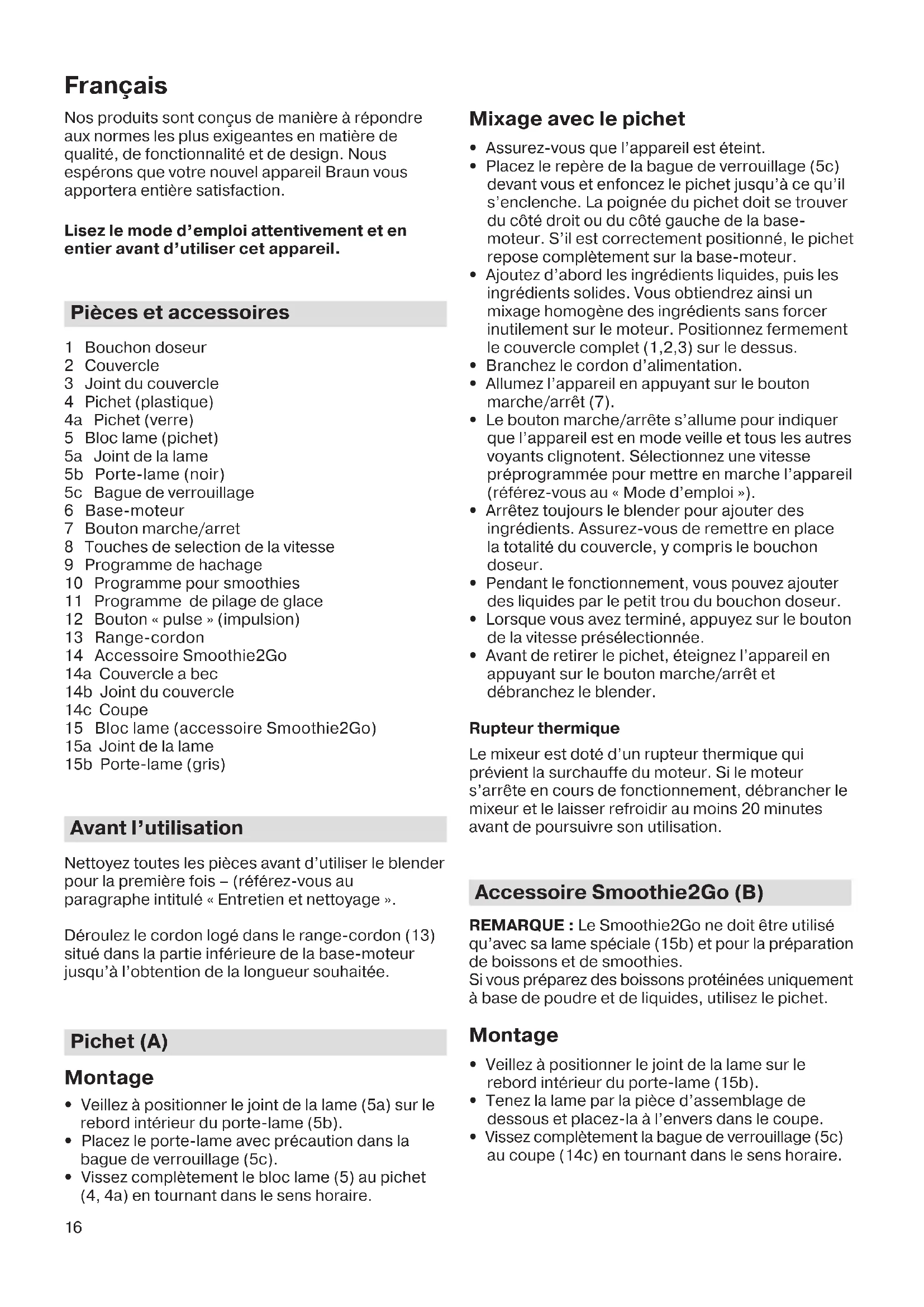 - ⅓ cup almonds Place all ingredients into the cup, in the order listed. Close the cup and shake it so that liquid and powder are well mixed. Blend the ingredients on max. speed for 60 sec. or use smoothie program if available. When preparing protein shakes using powder and liquids only, use the pitcher. 5722310394_JB_7xxx_USCA.indd 155722310394_JB_7xxx_USCA.indd 15 21.12.17 14:0821.12.17 14:0816 Français Nos produits sont conçus de manière à répondre aux normes les plus exigeantes en matière de qualité, de fonctionnalité et de design. Nous espérons que votre nouvel appareil Braun vous apportera entière satisfaction. Lisez le mode d’emploi attentivement et en entier avant d’utiliser cet appareil. Pièces et accessoires 1 Bouchon doseur 2 Couvercle 3 Joint du couvercle 4 Pichet (plastique) 4a Pichet (verre) 5 Bloc lame (pichet) 5a Joint de la lame 5b Porte-lame (noir) 5c Bague de verrouillage 6 Base-moteur 7 Bouton marche/arret 8 Touches de selection de la vitesse 9 Programme de hachage 10 Programme pour smoothies 11 Programme de pilage de glace 12 Bouton « pulse » (impulsion) 13 Range-cordon 14 Accessoire Smoothie2Go 14a Couvercle a bec 14b Joint du couvercle 14c Coupe 15 Bloc lame (accessoire Smoothie2Go) 15a Joint de la lame 15b Porte-lame (gris) Avant l’utilisation Nettoyez toutes les pièces avant d’utiliser le blender pour la première fois – (référez-vous au paragraphe intitulé « Entretien et nettoyage ». Déroulez le cordon logé dans le range-cordon (13) situé dans la partie inférieure de la base-moteur jusqu’à l’obtention de la longueur souhaitée. Pichet (A) Montage