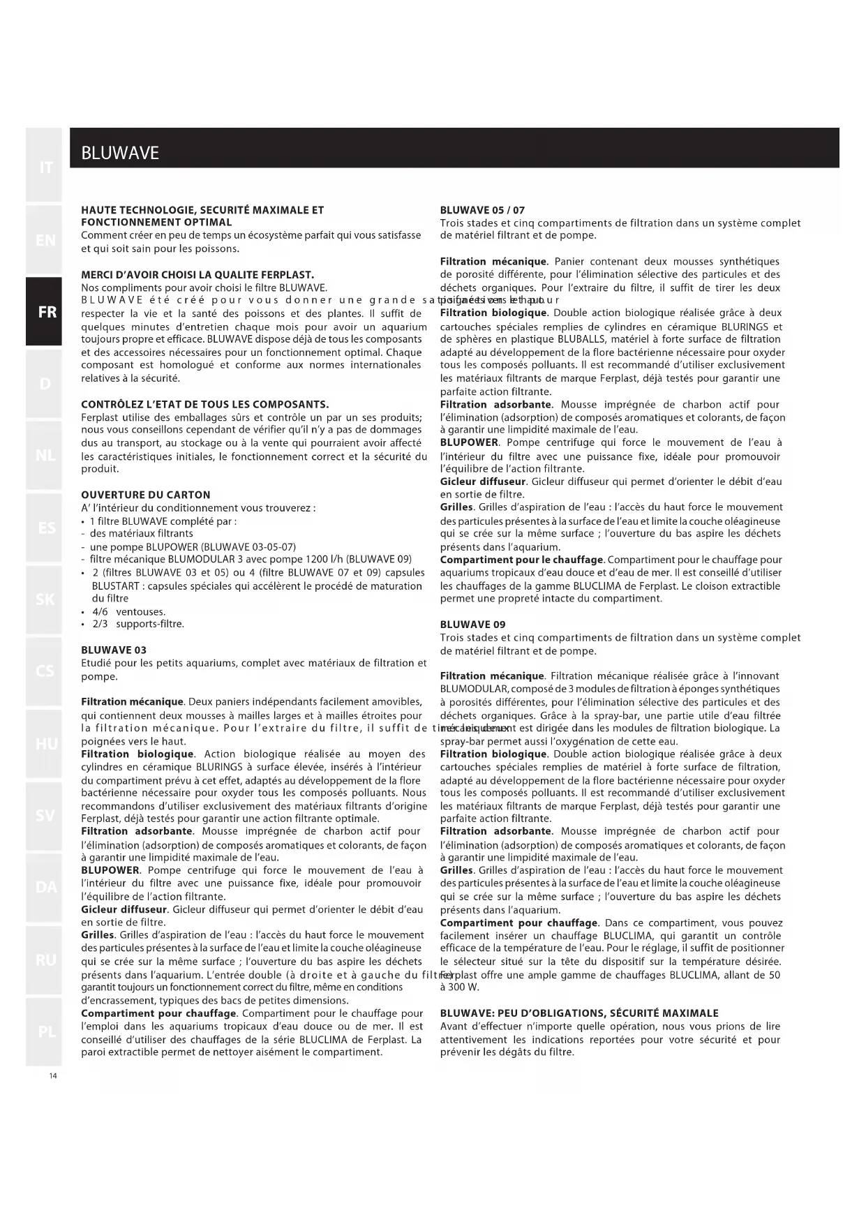 - 2/3 supports-filtre. BLUWAVE 03 Etudié pour les petits aquariums, complet avec matériaux de filtration et pompe. Filtration mécanique. Deux paniers indépendants facilement amovibles, qui contiennent deux mousses à mailles larges et à mailles étroites pour la filtration mécanique. Pour l’extraire du filtre, il suffit de tirer les deux poignées vers le haut. Filtration biologique. Action biologique réalisée au moyen des cylindres en céramique BLURINGS à surface élevée, insérés à l’intérieur du compartiment prévu à cet effet, adaptés au développement de la flore bactérienne nécessaire pour oxyder tous les composés polluants. Nous recommandons d’utiliser exclusivement des matériaux filtrants d’origine Ferplast, déjà testés pour garantir une action filtrante optimale. Filtration adsorbante. Mousse imprégnée de charbon actif pour l’élimination (adsorption) de composés aromatiques et colorants, de façon à garantir une limpidité maximale de l’eau. BLUPOWER. Pompe centrifuge qui force le mouvement de l’eau à l’intérieur du filtre avec une puissance fixe, idéale pour promouvoir l’équilibre de l’action filtrante. Gicleur diffuseur. Gicleur diffuseur qui permet d’orienter le débit d’eau en sortie de filtre. Grilles. Grilles d’aspiration de l’eau : l’accès du haut force le mouvement des particules présentes à la surface de l’eau et limite la couche oléagineuse qui se crée sur la même surface ; l’ouverture du bas aspire les déchets présents dans l’aquarium. L’entrée double (à droite et à gauche du filtre) garantit toujours un fonctionnement correct du filtre, même en conditions d’encrassement, typiques des bacs de petites dimensions. Compartiment pour chauffage. Compartiment pour le chauffage pour l’emploi dans les aquariums tropicaux d’eau douce ou de mer. Il est conseillé d’utiliser des chauffages de la série BLUCLIMA de Ferplast. La paroi extractible permet de nettoyer aisément le compartiment. BLUWAVE 05 / 07 Trois stades et cinq compartiments de filtration dans un système complet de matériel filtrant et de pompe. Filtration mécanique. Panier contenant deux mousses synthétiques de porosité différente, pour l’élimination sélective des particules et des déchets organiques. Pour l’extraire du filtre, il suffit de tirer les deux poignées vers le haut. Filtration biologique. Double action biologique réalisée grâce à deux cartouches spéciales remplies de cylindres en céramique BLURINGS et de sphères en plastique BLUBALLS, matériel à forte surface de filtration adapté au développement de la flore bactérienne nécessaire pour oxyder tous les composés polluants. Il est recommandé d’utiliser exclusivement les matériaux filtrants de marque Ferplast, déjà testés pour garantir une parfaite action filtrante. Filtration adsorbante. Mousse imprégnée de charbon actif pour l’élimination (adsorption) de composés aromatiques et colorants, de façon à garantir une limpidité maximale de l’eau. BLUPOWER. Pompe centrifuge qui force le mouvement de l’eau à l’intérieur du filtre avec une puissance fixe, idéale pour promouvoir l’équilibre de l’action filtrante. Gicleur diffuseur. Gicleur diffuseur qui permet d’orienter le débit d’eau en sortie de filtre. Grilles. Grilles d’aspiration de l’eau : l’accès du haut force le mouvement des particules présentes à la surface de l’eau et limite la couche oléagineuse qui se crée sur la même surface ; l’ouverture du bas aspire les déchets présents dans l’aquarium. Compartiment pour le chauffage. Compartiment pour le chauffage pour aquariums tropicaux d’eau douce et d’eau de mer. Il est conseillé d’utiliser les chauffages de la gamme BLUCLIMA de Ferplast. Le cloison extractible permet une propreté intacte du compartiment. BLUWAVE 09 Trois stades et cinq compartiments de filtration dans un système complet de matériel filtrant et de pompe. Filtration mécanique. Filtration mécanique réalisée grâce à l’innovant BLUMODULAR, composé de 3 modules de filtration à éponges synthétiques à porosités différentes, pour l’élimination sélective des particules et des déchets organiques. Grâce à la spray-bar, une partie utile d’eau filtrée mécaniquement est dirigée dans les modules de filtration biologique. La spray-bar permet aussi l’oxygénation de cette eau. Filtration biologique. Double action biologique réalisée grâce à deux cartouches spéciales remplies de matériel à forte surface de filtration, adapté au développement de la flore bactérienne nécessaire pour oxyder tous les composés polluants. Il est recommandé d’utiliser exclusivement les matériaux filtrants de marque Ferplast, déjà testés pour garantir une parfaite action filtrante. Filtration adsorbante. Mousse imprégnée de charbon actif pour l’élimination (adsorption) de composés aromatiques et colorants, de façon à garantir une limpidité maximale de l’eau. Grilles. Grilles d’aspiration de l’eau : l’accès du haut force le mouvement des particules présentes à la surface de l’eau et limite la couche oléagineuse qui se crée sur la même surface ; l’ouverture du bas aspire les déchets présents dans l’aquarium. Compartiment pour chauffage. Dans ce compartiment, vous pouvez facilement insérer un chauffage BLUCLIMA, qui garantit un contrôle efficace de la température de l’eau. Pour le réglage, il suffit de positionner le sélecteur situé sur la tête du dispositif sur la température désirée. Ferplast offre une ample gamme de chauffages BLUCLIMA, allant de 50 à 300 W. BLUWAVE: PEU D’OBLIGATIONS, SÉCURITÉ MAXIMALE Avant d’effectuer n’importe quelle opération, nous vous prions de lire attentivement les indications reportées pour votre sécurité et pour prévenir les dégâts du filtre. 363110-3_FI_BLUWAVE_nero.indd 14363110-3_FI_BLUWAVE_nero.indd 14 17/05/11 12.24