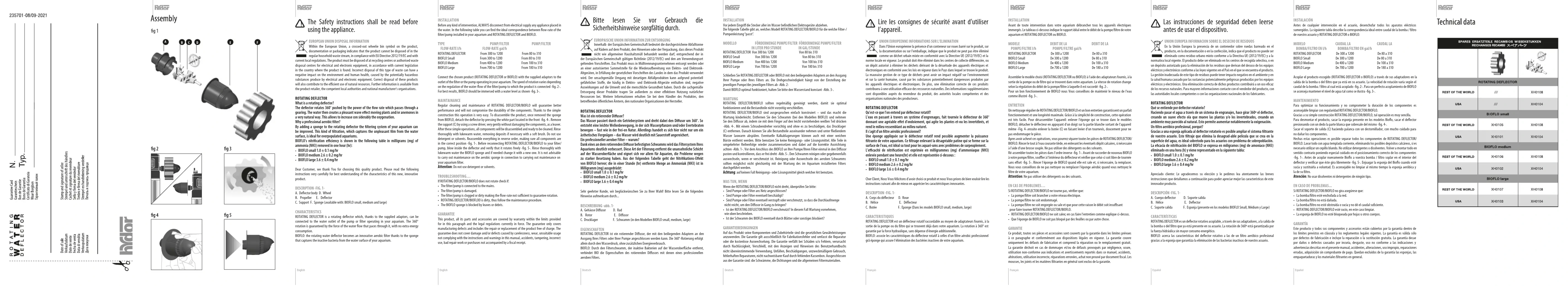 - BIOFLO large 3.6 ± 0.4 mg/hr Cher Client, Nous Vous félicitons d’avoir choisi ce produit et nous Vous prions de bien vouloir lire les instructions suivant an de mieux en apprécier les caractéristiques innovantes. DESCRIPTION -FIG. 1- A. Corps du déecteur D. Roue B. Hélice E. Déecteur C. Butée F. Eponge (Dans les models BIOFLO small, medium, large) CARACTERISTIQUES ROTATING DEFLECTOR est un déecteur rotatif raccordable au moyen de adaptateurs fournis, à la sortie de la pompe ou du ltre qui se trouvent déjà dans votre aquarium. La rotation à 360° est garantie par la force hydraulique, sans dépense d’énergie additionnelle. BIOFLO: associe les caractéristiques du déecteur rotatif à celles d’un ltre aérobic professionnel grâ éponge qui assure l’élimination des bactéries inactives de votre aquarium. INSTALLATION Avant de toute intervention dans votre aquarium débrancher tous les appareils électriques immergés. Le tableau ci-dessous indique le rapport idéal entre le débit de la pompe/ltre de votre aquarium et ROTATING DEFLECTOR ou BIOFLO. MODELE DEBIT DE LA DEBIT DE LA POMPE/FILTRE l/h POMPE/FILTRE gal/h ROTATING DEFLECTOR De 300 a 1200 De 80 a 310 BIOFLO Small De 300 a 1200 De 80 a 310 BIOFLO Medium De 400 a 1200 De 100 a 310 BIOFLO Large De 700 a 1200 De 180 a 310 Assembler le modèle choisi (ROTATING DEFLECTOR ou BIOFLO) à l’aide des adaptateurs fournis, à la sortie de la pompe ou de ltre qui se trouvent dans votre aquarium. La vitesse de rotation change selon la régulation du débit de la pompe/ltre à laquelle il est raccordé -g. 2-. Pour un bon fonctionnement de BIOFLO nous Vous conseillons de maintenir le niveau de l’eau comme illustré -g. 3-. ENTRETIEN Un nettoyage régulier de ROTATING DEFLECTOR/BIOFLO et un bon entretien garantissent un parfait fonctionnement et une longévité maximale. Grâce à la simplicité de construction, cette opération est très facile. Pour désassembler l’appareil: enlever l’éponge qui se trouve dans le modèles BIOFLO, détacher le déecteur en appuyant d’un doigt sur la partie blanche sortant de l’appareil même -Fig. 4-.ensuite enlever la butée (C) en faisant levier d’un tournevis, doucement pour ne pas endommager le pièce. Apres avoir achevé ces opérations, vous pourrez séparer toutes les pièces de ROTATING DEFLECTOR/ BIOFLO. Rincer le tout à l’eau courante tiède, en enlevant les éventuels dépôt calcaires, si nécessaire à l’aide d’une brosse souple. Ne pas utiliser des détergents ou des solvants. Ré-assembler toutes les pièces dans l’ordre inverse -g. 1-. Avant de raccorder de nouveau BIOFLO à votre pompe/ltre, souer à l’intérieur du déecteur et vérier que celui-ci soit libre de tournée sans eort -g. 5-. Rincer l’éponge de BIOFLO quand elle est sale et, si nécessaire, la remplacer. Nous vous conseillons de ne pas nettoyer ou remplacer l’éponge aérobic quand vous nettoyez le ltre de votre aquarium. Attention: Ne pas utiliser des détergents ou des solvants.