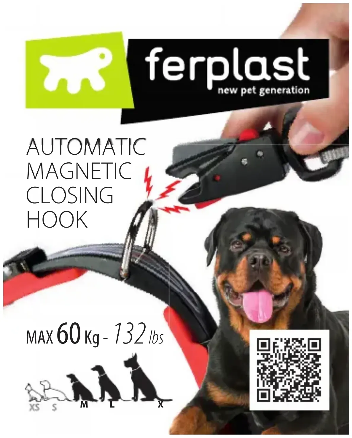 - Non agganciare più di un anello al moschettone.FR - Ferplast a crée le premier mousqueton au- tomatique avec laisse pour chiens. Il combine sécurité maximale et facilité d’utilisation. En effet, il est très facile et rapide de le mettre et de l’enlever du collier/ harnais grâce au mécanisme magnétique. Fabriqué en « technoplastique » il est léger et robuste en même temps. Disponible en 2 tailles, il assure, grâce aussi à des boulons en acier, une tenue à la traction jusqu’à 120 kg (264Ibs) pour le modèle médium et jusqu’à 180 kg (397Ibs) pour le large. Il est extrêmement sûr grâce au sytème d’ouverture à double bouton qui évite toute ouverture accidentelle. Instructions pour l’utilisation: