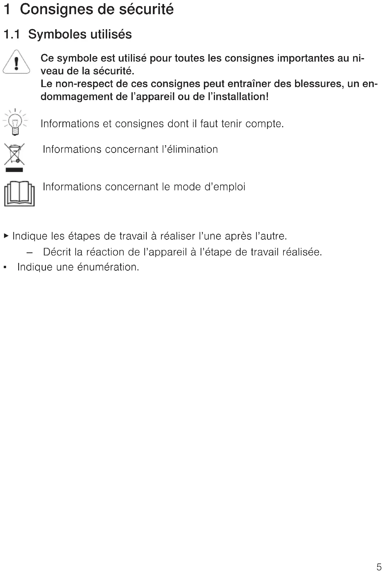 Ce symbole est utilisé pour toutes les consignes importantes au ni- veau de la sécurité. Le non-respect de ces consignes peut entraîner des blessures, un en- dommagement de l’appareil ou de l’installation! Informations et consignes dont il faut tenir compte. Informations concernant l’élimination Informations concernant le mode d’emploi