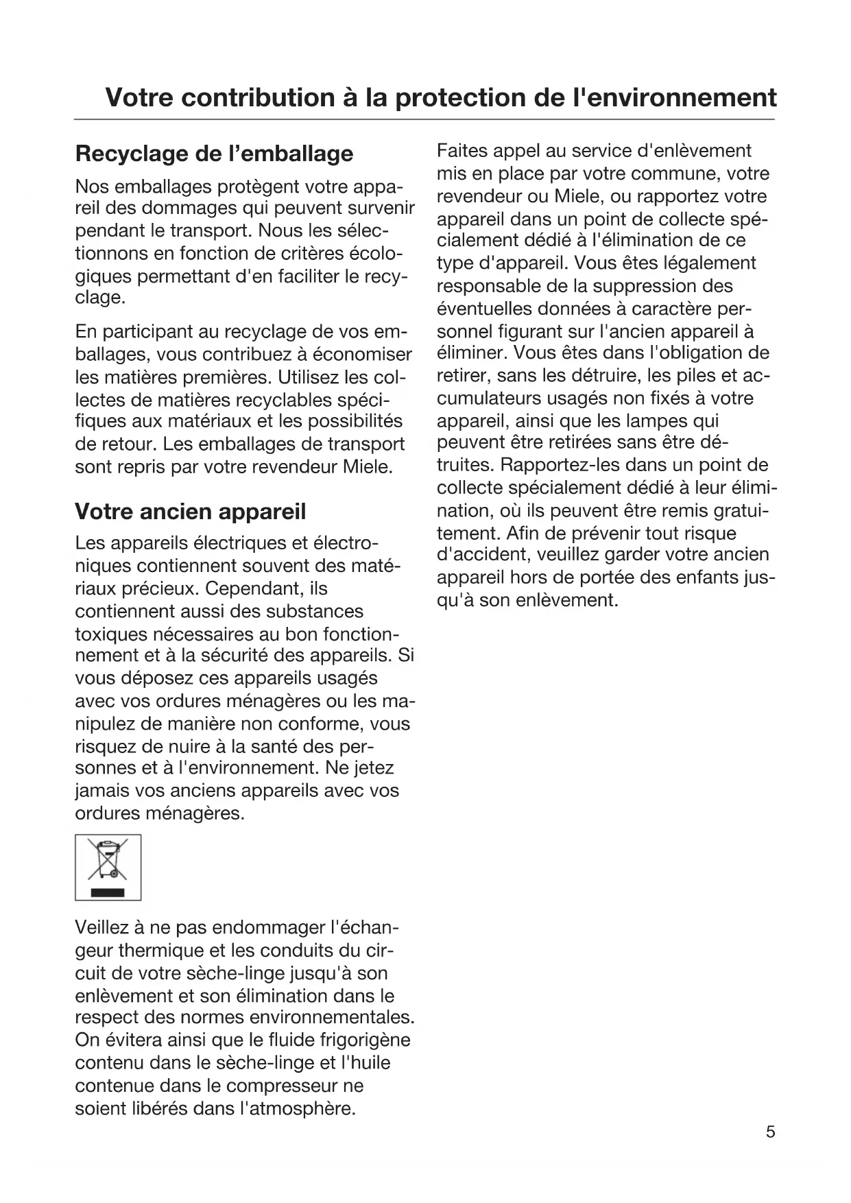 Recyclage de l’emballage Nos emballages protègent votre appa- reil des dommages qui peuvent survenir pendant le transport. Nous les sélec- tionnons en fonction de critères écolo- giques permettant d'en faciliter le recy- clage. En participant au recyclage de vos em- ballages, vous contribuez à économiser les matières premières. Utilisez les col- lectes de matières recyclables spéci- fiques aux matériaux et les possibilités de retour. Les emballages de transport sont repris par votre revendeur Miele. Votre ancien appareil Les appareils électriques et électro- niques contiennent souvent des maté- riaux précieux. Cependant, ils contiennent aussi des substances toxiques nécessaires au bon fonction- nement et à la sécurité des appareils. Si vous déposez ces appareils usagés avec vos ordures ménagères ou les ma- nipulez de manière non conforme, vous risquez de nuire à la santé des per- sonnes et à l'environnement. Ne jetez jamais vos anciens appareils avec vos ordures ménagères. Veillez à ne pas endommager l'échan- geur thermique et les conduits du cir- cuit de votre sèche-linge jusqu'à son enlèvement et son élimination dans le respect des normes environnementales. On évitera ainsi que le fluide frigorigène contenu dans le sèche-linge et l'huile contenue dans le compresseur ne soient libérés dans l'atmosphère. Faites appel au service d'enlèvement mis en place par votre commune, votre revendeur ou Miele, ou rapportez votre appareil dans un point de collecte spé- cialement dédié à l'élimination de ce type d'appareil. Vous êtes légalement responsable de la suppression des éventuelles données à caractère per- sonnel figurant sur l'ancien appareil à éliminer. Vous êtes dans l'obligation de retirer, sans les détruire, les piles et ac- cumulateurs usagés non fixés à votre appareil, ainsi que les lampes qui peuvent être retirées sans être dé- truites. Rapportez-les dans un point de collecte spécialement dédié à leur élimi- nation, où ils peuvent être remis gratui- tement. Afin de prévenir tout risque d'accident, veuillez garder votre ancien appareil hors de portée des enfants jus- qu'à son enlèvement.Consignes de sécurité et mises en garde
