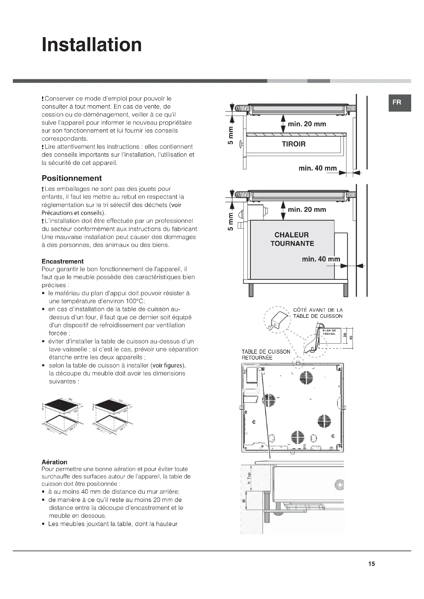- selon la table de cuisson à installer (voir gures), la découpe du meuble doit avoir les dimensions suivantes : Aération Pour permettre une bonne aération et pour éviter toute surchauffe des surfaces autour de l’appareil, la table de cuisson doit être positionnée :