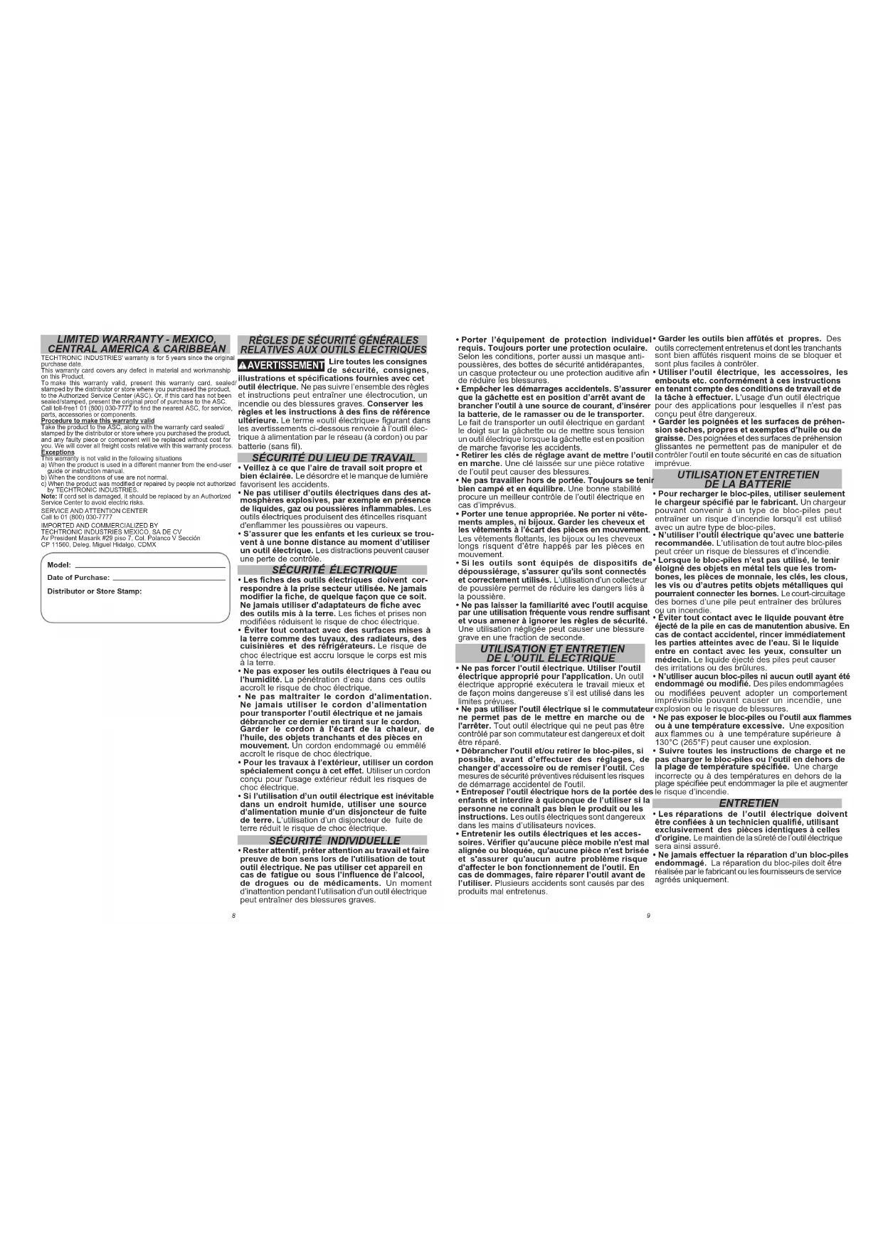 TECHTRONIC INDUSTRIES' garantit le produit pendant 5 ans à partir de la date d’achat d’origine. Le présent bon de garantie couvre tous les vices de matériau et de fabrication que peut afcher ce produit. Pour assurer la validité de la présente garantie, veuillez présenter ce bon de garantie, estampillé du sceau du distributeur ou du magasin où le produit a été acheté, au centre de réparations agréé. Si le bon de garantie n’a pas été estampillé, veuillez fournir la preuve d’achat d’origine au centre de réparations agréé. Pour un entretien des pièces, des accessoires ou des composants, composer sans frais le 1-800-030-7777 an d’obtenir les coordonnées du centre de réparations agréé le plus près Procédure pour assurer la validité de la garantie Présenter le produit au centre de réparations agréé, accompagné du bon de garantie estampillé du sceau du distributeur ou du magasin où le produit a été acheté. Toute pièce défectueuse ou tout composant défectueux sera remplacé(e) sans frais. Milwaukee assume tous les frais de transport liés à ce processus de garantie. Exceptions Cette garantie ne s’applique pas dans les situations suivantes : a) Si le produit a été utilisé pour une n autre que celle indiquée dans le guide de l’utilisateur nal ou le manuel d’instructions. b) Si les conditions d’utilisations ne sont pas habituelles. c) Si le produit a été modié ou réparé par une personne non autorisée par TECHTRONIC INDUSTRIES. Remarque : Si le cordon électrique est endommagé, il doit être remplacé par un centre de réparations agréé pour éviter les risques d’électrocution. CENTRE DE RÉPARATIONS ET DE SERVICE Composer le 01 (800) 030-7777