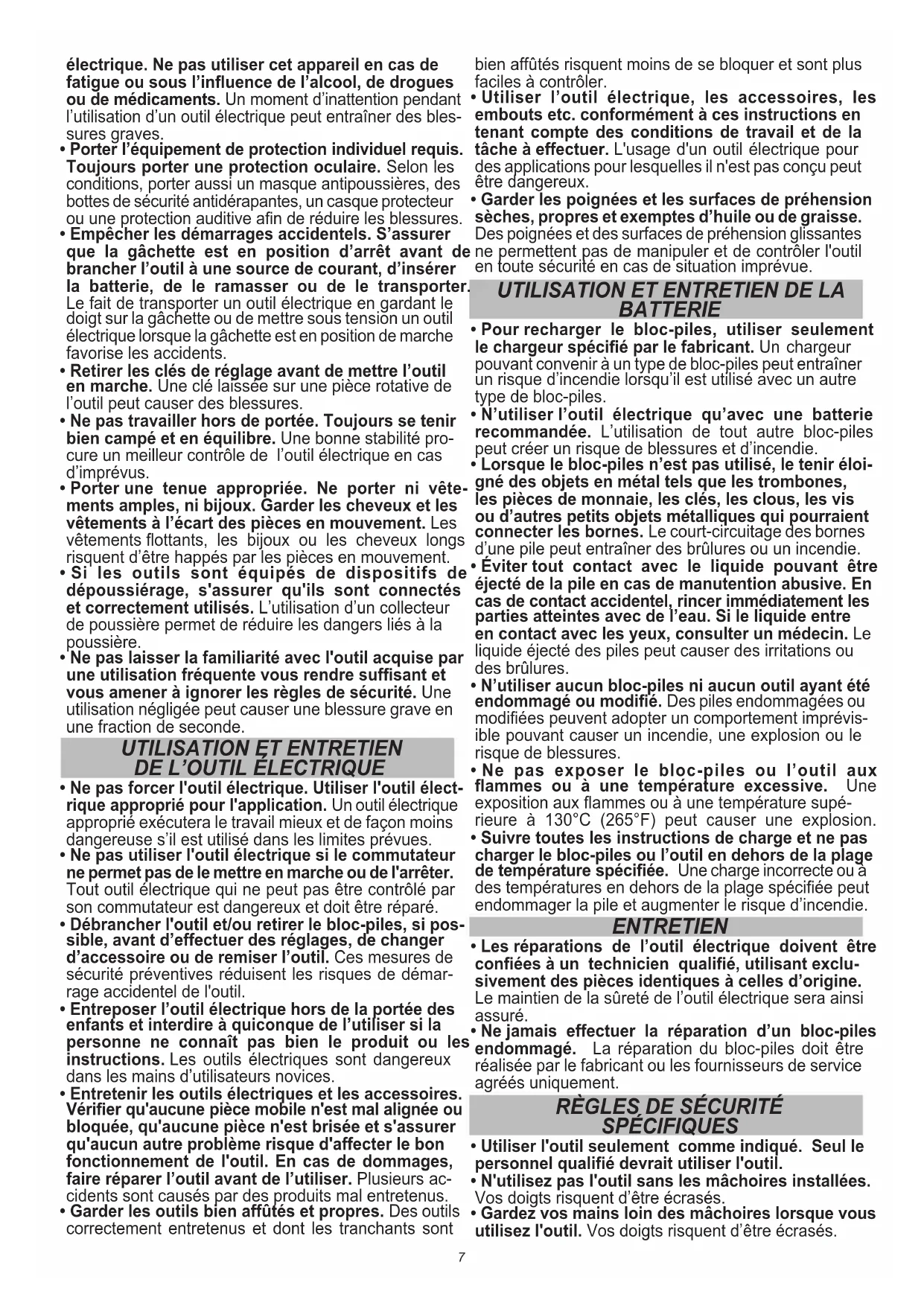 | Maintenance et réparation | Vérifier régulièrement l'état de la batterie et des accessoires. Nettoyer après chaque utilisation. |