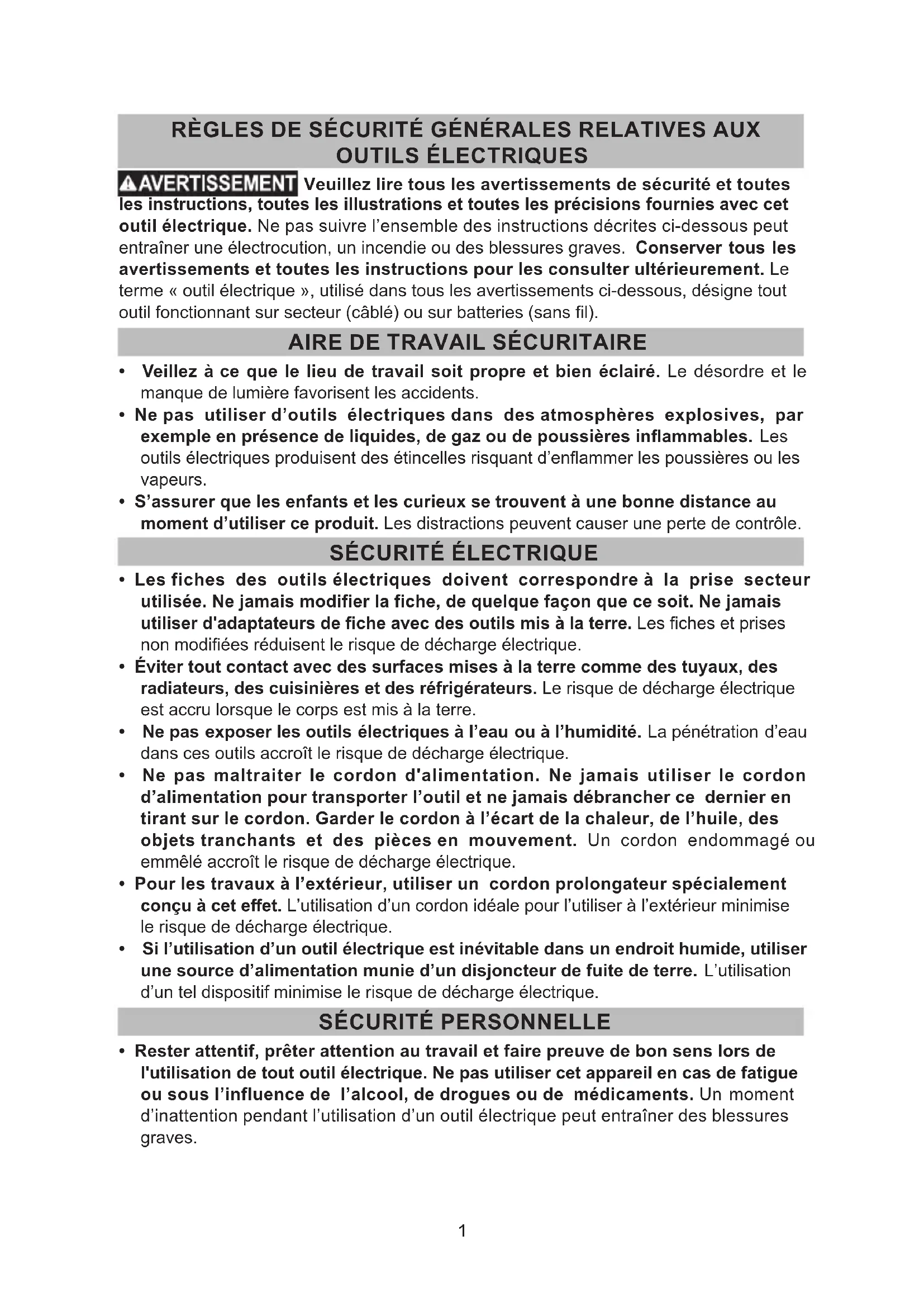 - Ne pas forcer l’outil électrique. Utiliser l'outil approprié pour l'application. Un outil approprié exécutera le travail mieux et de façon moins dangereuse s’il est utilisé dans les limites prévues.