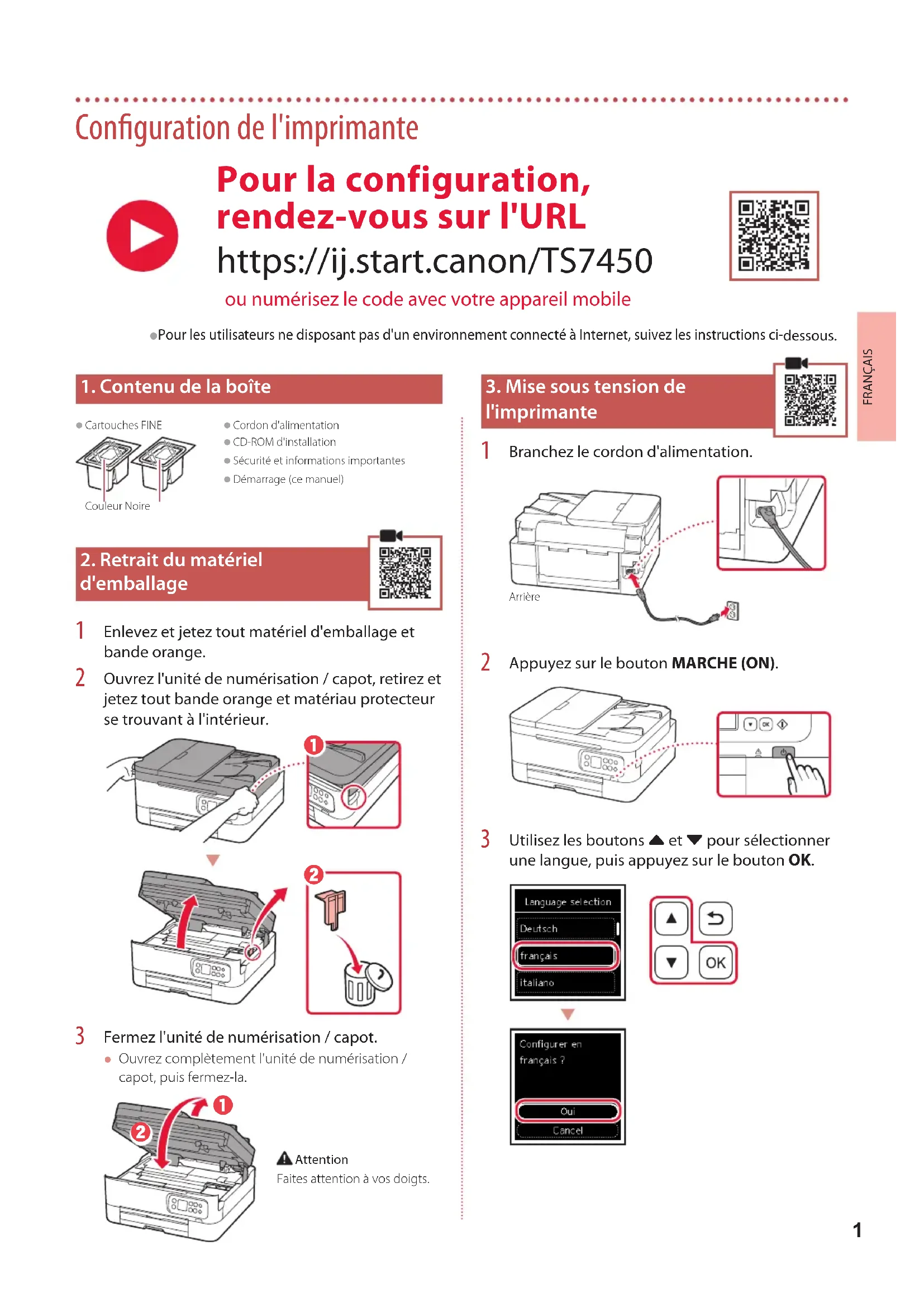 Utilisez les boutons { et } pour sélectionner une langue, puis appuyez sur le bouton OK. Pour la configuration, rendez-vous sur l'URL https://ij.start.canon/TS7450 ou numérisez le code avec votre appareil mobile