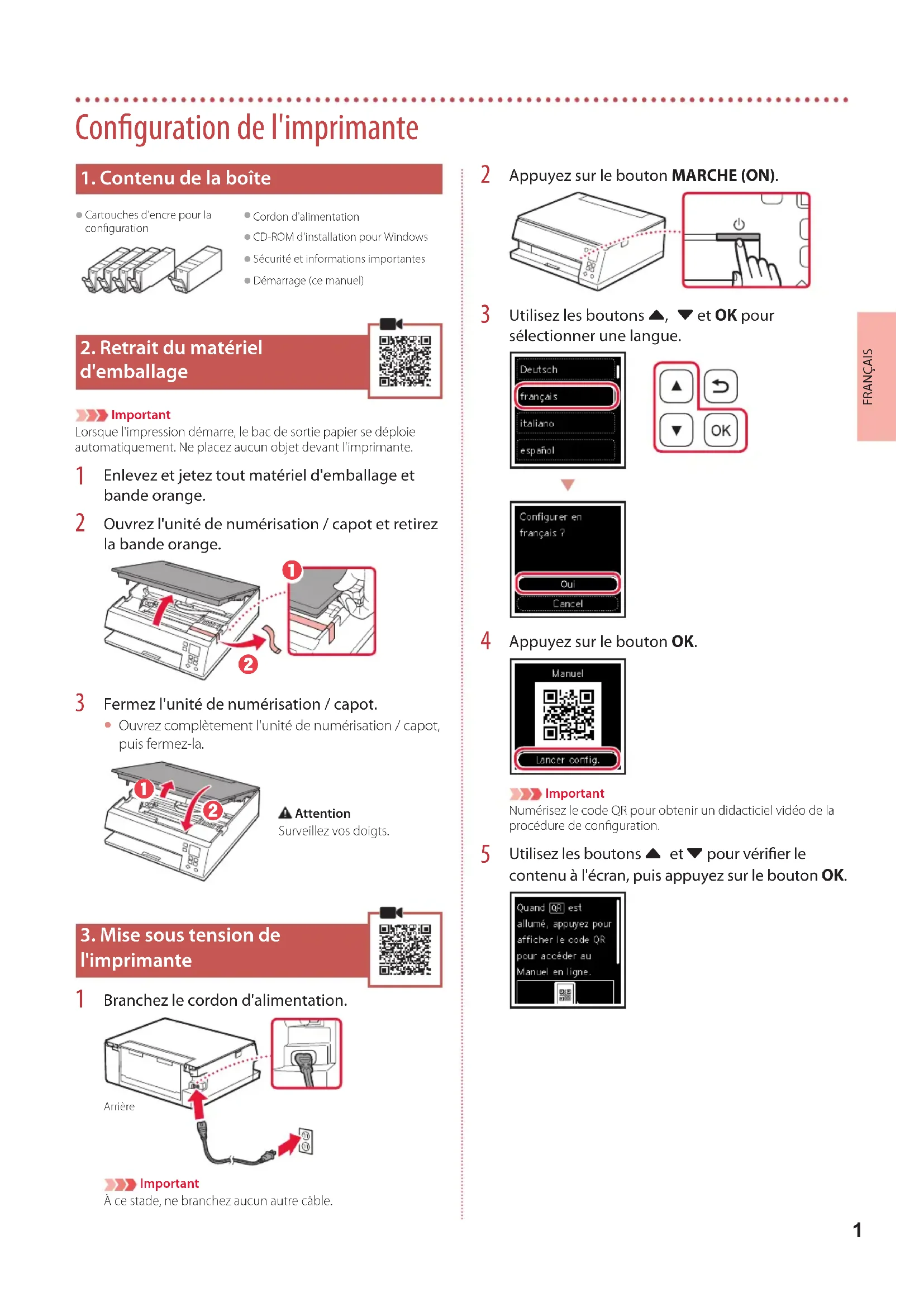 d'emballage ImportantLorsque l'impression démarre, le bac de sortie papier se déploie automatiquement. Ne placez aucun objet devant l'imprimante.