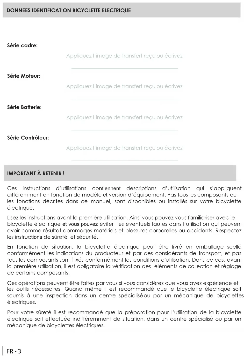 IMPORTANT À RETENIR ! Ces instructions d’utilisations contiennent descriptions d’utilisation qui s’appliquent différemment en fonction de modèle et version d’équipement. Pas tous les composants ou les fonctions décrites dans ce manuel, sont disponibles ou installés sur votre bicyclette électrique. Lisez les instructions avant la première utilisation. Ainsi vous pouvez vous familiariser avec le bicyclette élec trique et vous pouvez éviter les éventuels fautes dans l’utilisation qui peuvent avoir comme résultat dommages matériels et blessures corporelles ou accidents. Respectez les instructions de sûreté et sécurité. En fonction de situation, la bicyclette électrique peut être livré en emballage scellé conformément les indications du producteur et par des considérants de transport, et pas tous les composants sont f ixés conformément les conditions d'utilisation. Dans ce cas, avant la première utilisation, il est obligatoire la vérification des éléments de collection et réglage de certains composants. Ces opérations peuvent être faites par vous si vous considérez que vous avez expérience et les outils nécessaires. Quand même il est recommandé que le bicyclette électrique soit soumis à une inspection dans un centre spécialisé ou par un mécanique de bicyclettes électriques. Pour votre sûreté il est recommandé que la préparation pour l’utilisation de la bicyclette électrique soit effectuée indifféremment de situation, dans un centre spécialisé ou par un mécanique de bicyclettes électriques.