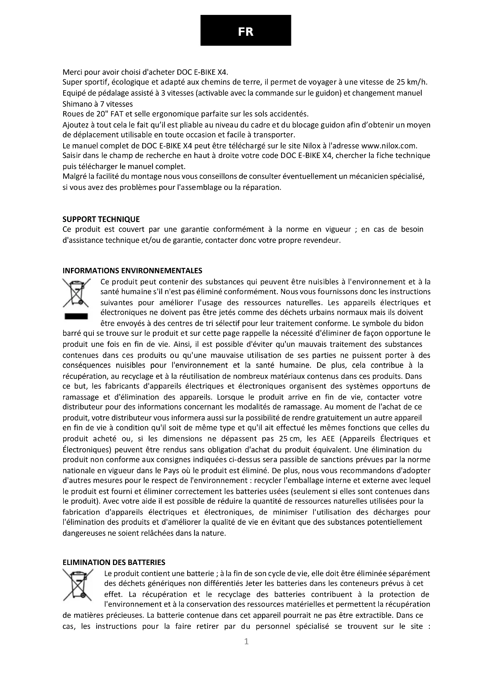Merci pour avoir choisi d'acheter DOC E-BIKE X4. Super sportif, écologique et adapté aux chemins de terre, il permet de voyager à une vitesse de 25 km/h. Equipé de pédalage assisté à 3 vitesses (activable avec la commande sur le guidon) et changement manuel Shimano à 7 vitesses Roues de 20" FAT et selle ergonomique parfaite sur les sols accidentés. Ajoutez à tout cela le fait qu’il est pliable au niveau du cadre et du blocage guidon afin d’obtenir un moyen de déplacement utilisable en toute occasion et facile à transporter. Le manuel complet de DOC E-BIKE X4 peut être téléchargé sur le site Nilox à l'adresse www.nilox.com. Saisir dans le champ de recherche en haut à droite votre code DOC E-BIKE X4, chercher la fiche technique puis télécharger le manuel complet. Malgré la facilité du montage nous vous conseillons de consulter éventuellement un mécanicien spécialisé, si vous avez des problèmes pour l'assemblage ou la réparation.