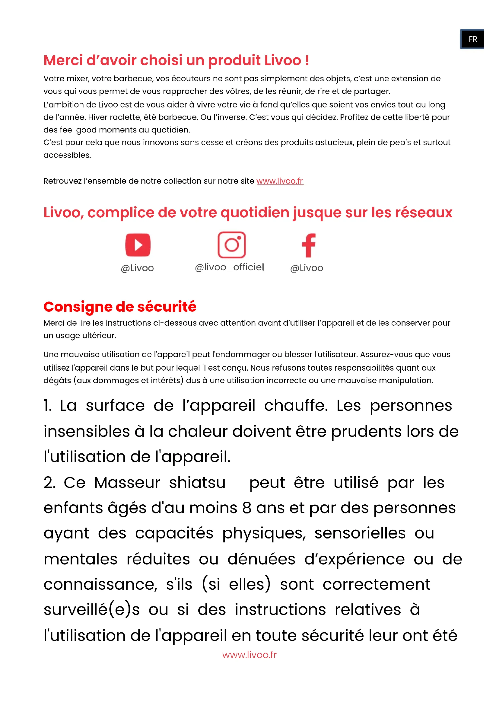 si vous souhaitez l'éteindre plus tôt. Débranchez l'adaptateur secteur après utilisation. Nettoyage et entretien Nettoyez la base du masseur shiatzu avec un chiffon humide si besoin. N’utilisez pas de détergents abrasifs. Ils pourraient endommager la surface. Chausson amovible : lavage délicat 30° en machine. Conservez l'appareil de massage dans un environnement sec et à des températures comprises entre 0 et 40 °C. Mise au rebut correcte de l'appareil (Equipement électrique et électronique). (Applicable dans l'Union européenne et dans les autres pays d'Europe qui ont adopté des systèmes de collecte séparés). La directive Européenne 2012/19/EU sur les Déchets des Equipements Electriques et Electroniques (DEEE), exige que les appareils ménagers usagés ne soient pas jetés dans le flux normal des déchets ménagers. Les appareils usagés doivent être collectés séparément afin d'optimiser le taux de récupération et le recyclage des matériaux qui les composent et réduire l'impact sur la santé humaine et l'environnement. Le symbole de la poubelle barrée est apposé sur tous les produits pour rappeler les obligations de la collecte séparée. Les consommateurs devront contacter les autorités locales ou leur revendeur concernant la démarche à suivre pour l'enlèvement de leur appareil.www.livoo.fr Thank you for choosing a Livoo product! Your blender, your barbecue, and your headphones are not just objects, they are extensions of yourself, allowing you to get closer to your friends and family, to bring them together, to laugh and to share experiences. Livoo's aim is to help you live your life to the fullest, whatever wishes you have throughout the year. Winter raclette, summer barbecue. Or the other way around. It's up to you. Take advantage of this freedom for feel good moments every day. That's why we're constantly innovating and creating clever products full of zest, but most of all, accessible. Find our entire collection on our website www.livoo.en. Livoo, your daily companion till social networks