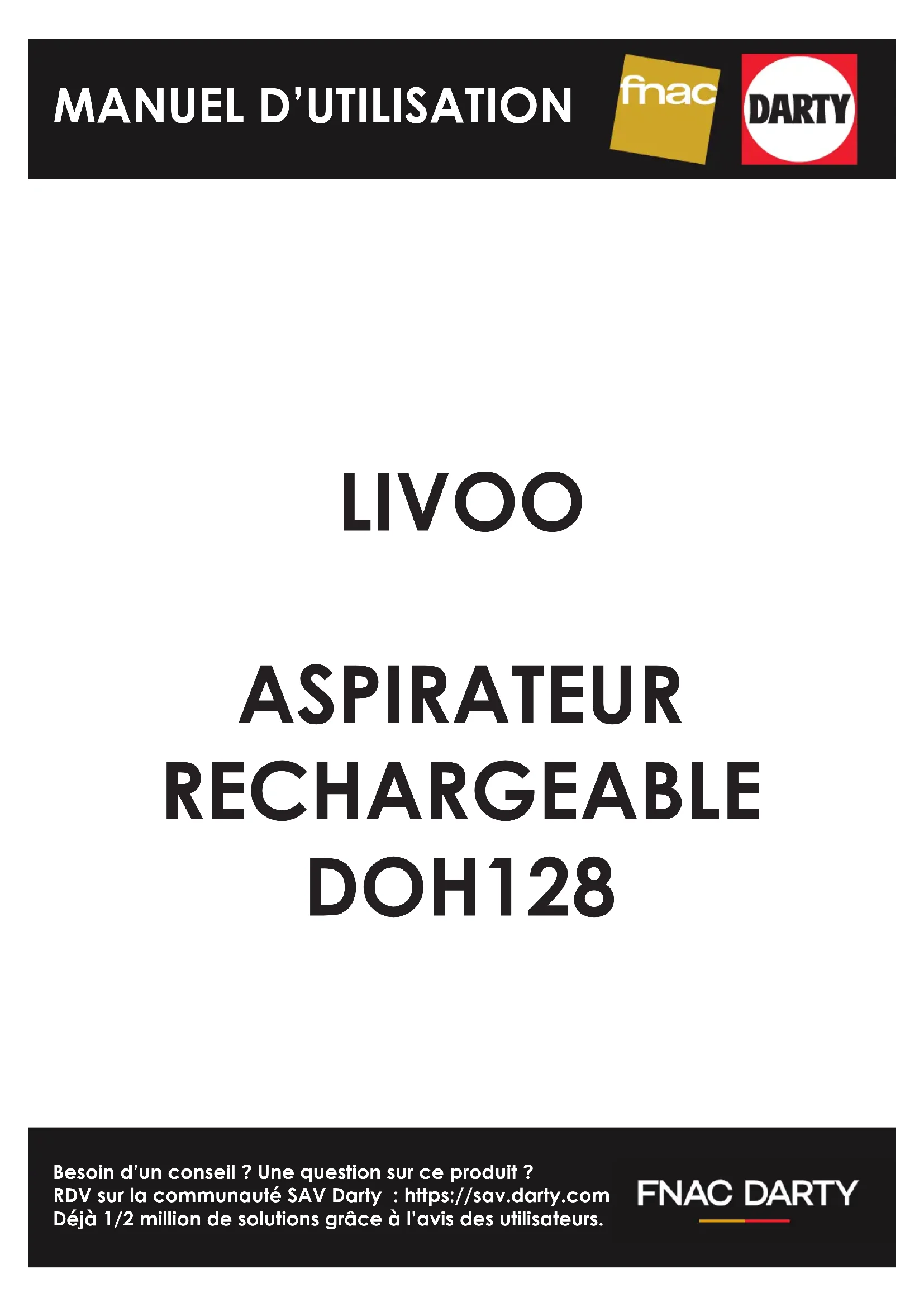 Besoin d’un conseil ? Une question sur ce produit ? RDV sur la communauté SAV Darty : https://sav.darty.com Déjà 1/2 million de solutions grâce à l’avis des utilisateurs. LIVOO ASPIRATEUR RECHARGEABLE DOH128 MANUEL D’UTILISATIONNotice d’utilisation