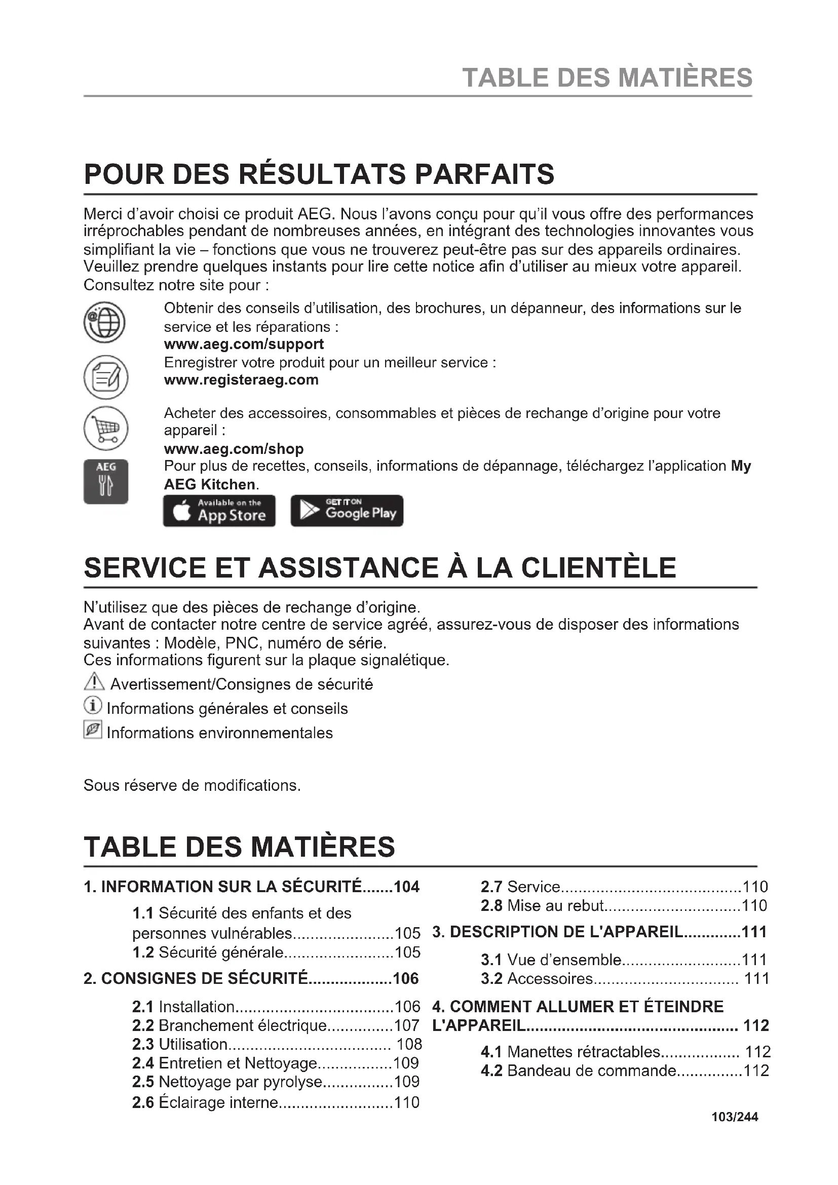 Merci d’avoir choisi ce produit AEG. Nous l’avons conçu pour qu’il vous offre des performances irréprochables pendant de nombreuses années, en intégrant des technologies innovantes vous simplifiant la vie – fonctions que vous ne trouverez peut-être pas sur des appareils ordinaires. Veuillez prendre quelques instants pour lire cette notice afin d’utiliser au mieux votre appareil. Consultez notre site pour : Obtenir des conseils d’utilisation, des brochures, un dépanneur, des informations sur le service et les réparations : www.aeg.com/support Enregistrer votre produit pour un meilleur service : www.registeraeg.com Acheter des accessoires, consommables et pièces de rechange d’origine pour votre appareil : www.aeg.com/shop Pour plus de recettes, conseils, informations de dépannage, téléchargez l’application My AEG Kitchen.
