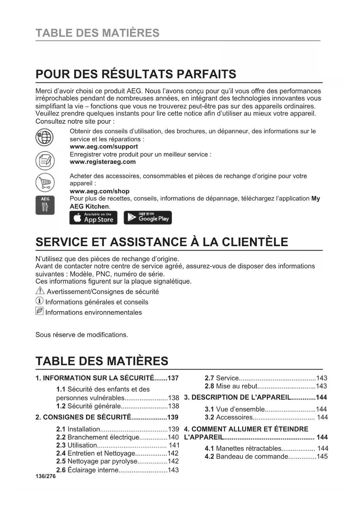 Merci d’avoir choisi ce produit AEG. Nous l’avons conçu pour qu’il vous offre des performances irréprochables pendant de nombreuses années, en intégrant des technologies innovantes vous simplifiant la vie – fonctions que vous ne trouverez peut-être pas sur des appareils ordinaires. Veuillez prendre quelques instants pour lire cette notice afin d’utiliser au mieux votre appareil. Consultez notre site pour : Obtenir des conseils d’utilisation, des brochures, un dépanneur, des informations sur le service et les réparations : www.aeg.com/support Enregistrer votre produit pour un meilleur service : www.registeraeg.com Acheter des accessoires, consommables et pièces de rechange d’origine pour votre appareil : www.aeg.com/shop Pour plus de recettes, conseils, informations de dépannage, téléchargez l’application My AEG Kitchen.