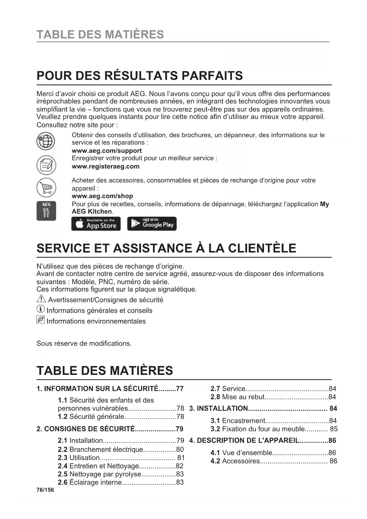 Merci d’avoir choisi ce produit AEG. Nous l’avons conçu pour qu’il vous offre des performances irréprochables pendant de nombreuses années, en intégrant des technologies innovantes vous simplifiant la vie – fonctions que vous ne trouverez peut-être pas sur des appareils ordinaires. Veuillez prendre quelques instants pour lire cette notice afin d’utiliser au mieux votre appareil. Consultez notre site pour : Obtenir des conseils d’utilisation, des brochures, un dépanneur, des informations sur le service et les réparations : www.aeg.com/support Enregistrer votre produit pour un meilleur service : www.registeraeg.com Acheter des accessoires, consommables et pièces de rechange d’origine pour votre appareil : www.aeg.com/shop Pour plus de recettes, conseils, informations de dépannage, téléchargez l’application My AEG Kitchen.