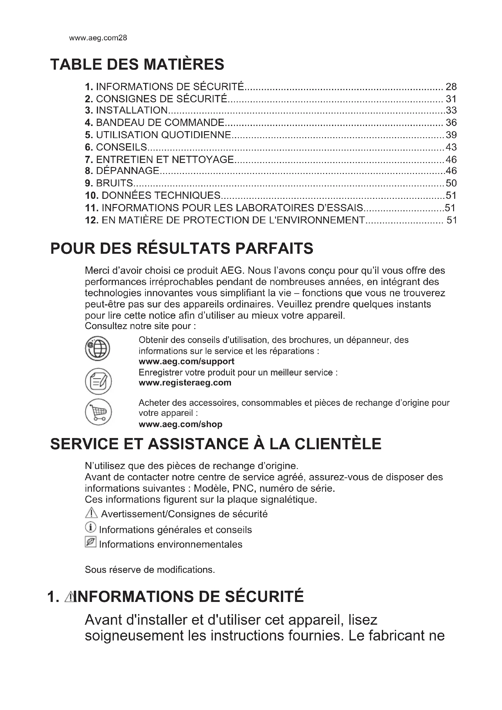Avant d'installer et d'utiliser cet appareil, lisez soigneusement les instructions fournies. Le fabricant ne www.aeg.com28pourra être tenu pour responsable des blessures et dégâts résultant d'une mauvaise installation ou utilisation. Conservez toujours les instructions dans un lieu sûr et accessible pour vous y référer ultérieurement.