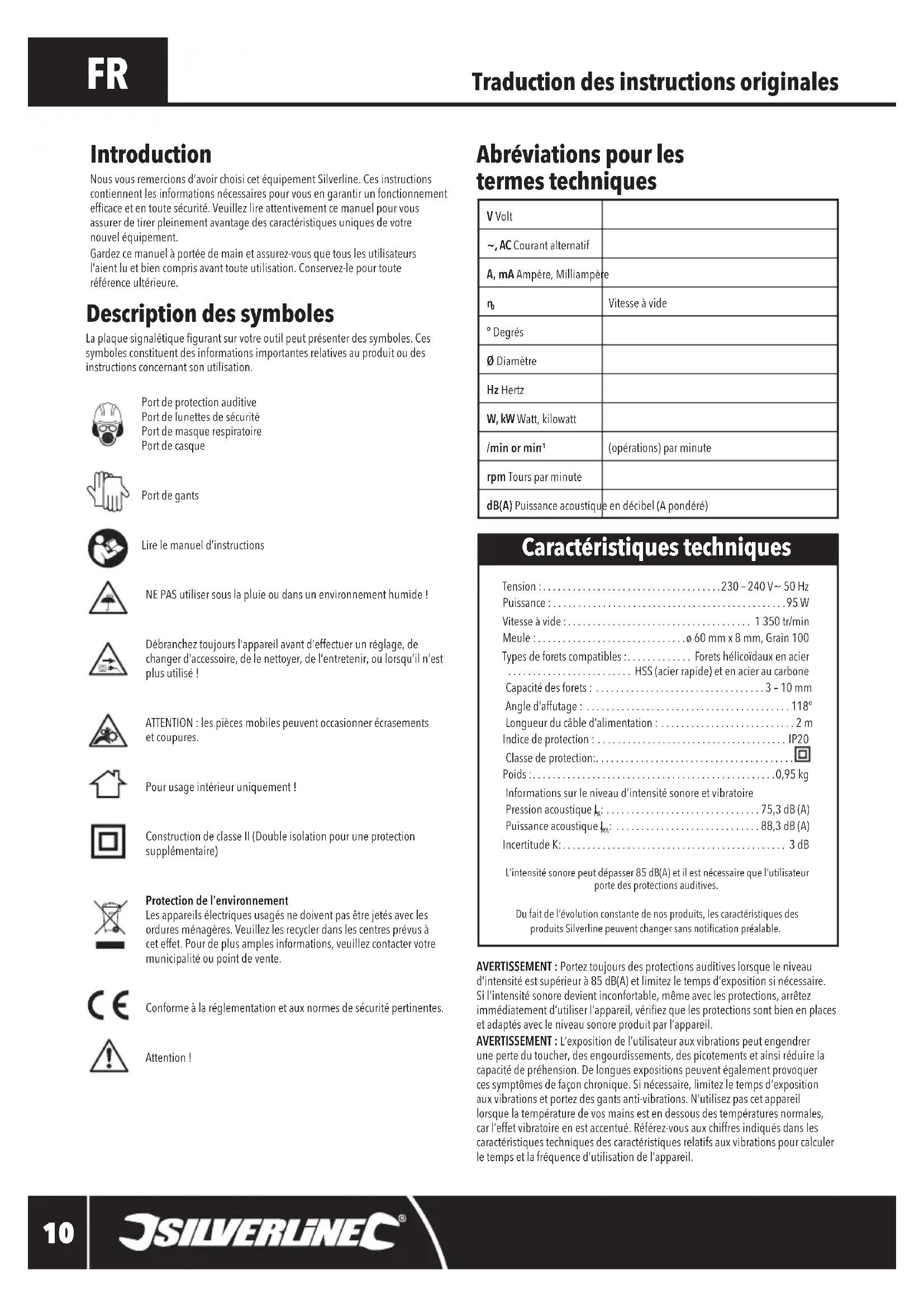 unepertedutoucher,desengourdissements,despicotementsetainsiréduirela capacitédepréhension.Delonguesexpositionspeuventégalementprovoquer cessymptômesdefaçonchronique.Sinécessaire,limitezletempsd’exposition auxvibrationsetportezdesgantsanti-vibrations.N’utilisezpascetappareil lorsquelatempératuredevosmainsestendessousdestempératuresnormales, carl’effetvibratoireenestaccentué.Référez-vousauxchiffresindiquésdansles caractéristiquestechniquesdescaractéristiquesrelatifsauxvibrationspourcalculer letempsetlafréquenced’utilisationdel’appareil. Abréviations pour les termes techniques Description des symboles Laplaquesignalétiquegurantsurvotreoutilpeutprésenterdessymboles.Ces symbolesconstituentdesinformationsimportantesrelativesauproduitoudes instructionsconcernantsonutilisation. Portdeprotectionauditive Portdelunettesdesécurité Portdemasquerespiratoire Portdecasque Portdegants Lirelemanueld’instructions NEPASutilisersouslapluieoudansunenvironnementhumide! Débrancheztoujoursl’appareilavantd’effectuerunréglage,de changerd’accessoire,delenettoyer,del’entretenir,oulorsqu’iln’est plusutilisé! ATTENTION:lespiècesmobilespeuventoccasionnerécrasements etcoupures. Pourusageintérieuruniquement! ConstructiondeclasseII(Doubleisolationpouruneprotection supplémentaire) Protection de l’environnement Lesappareilsélectriquesusagésnedoiventpasêtrejetésavecles orduresménagères.Veuillezlesrecyclerdanslescentresprévusà ceteffet.Pourdeplusamplesinformations,veuillezcontactervotre municipalitéoupointdevente. Conformeàlaréglementationetauxnormesdesécuritépertinentes. Attention! Introduction Nousvousremercionsd’avoirchoisicetéquipementSilverline.Cesinstructions contiennentlesinformationsnécessairespourvousengarantirunfonctionnement efcaceetentoutesécurité.Veuillezlireattentivementcemanuelpourvous assurerdetirerpleinementavantagedescaractéristiquesuniquesdevotre nouveléquipement. Gardezcemanuelàportéedemainetassurez-vousquetouslesutilisateurs l’aientluetbiencomprisavanttouteutilisation.Conservez-lepourtoute référenceultérieure. Traduction des instructions originales