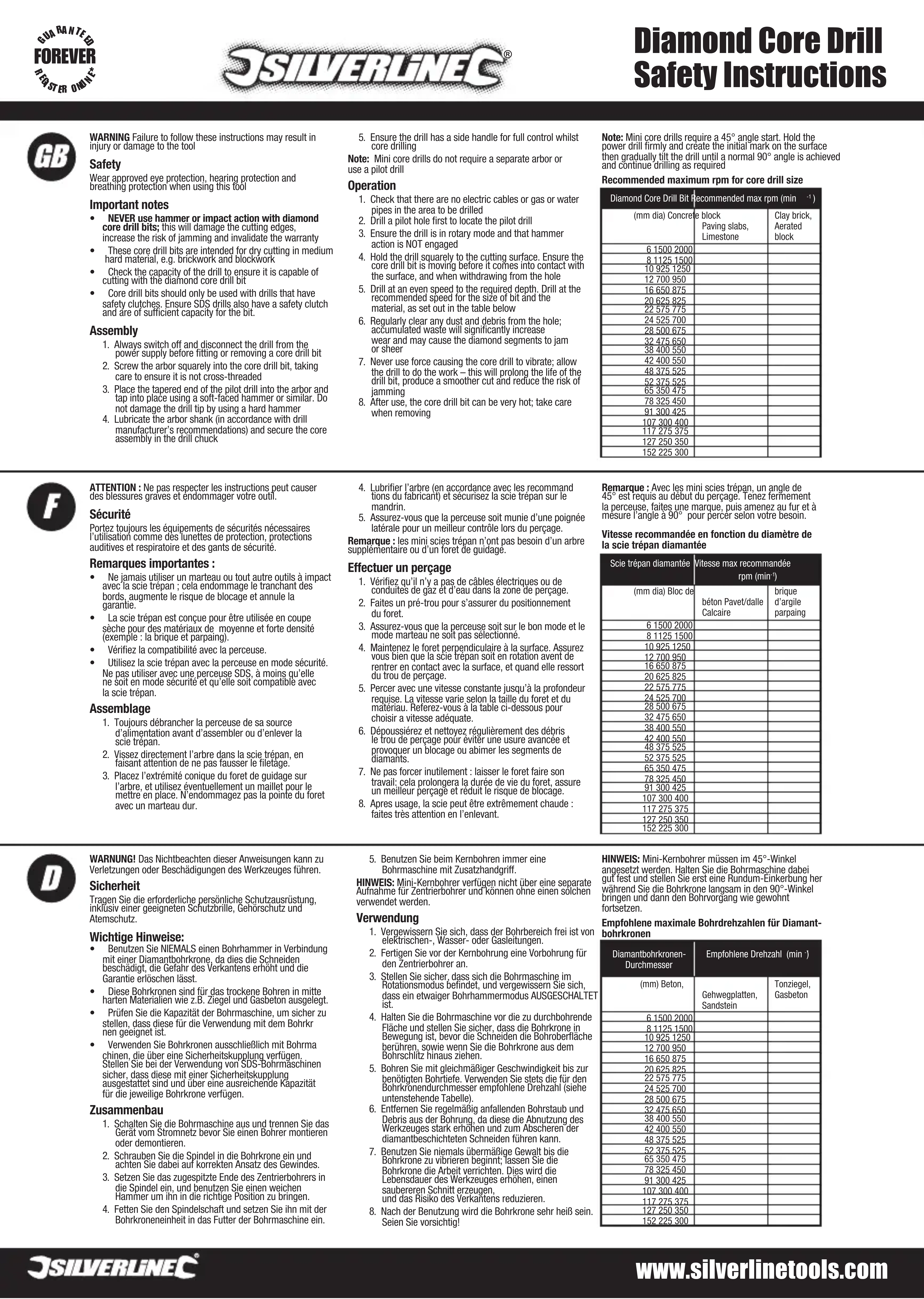 Vitesse recommandée en fonction du diamètre de la scie trépan diamantée Scie trépan diamantée Vitesse max recommandée rpm (min