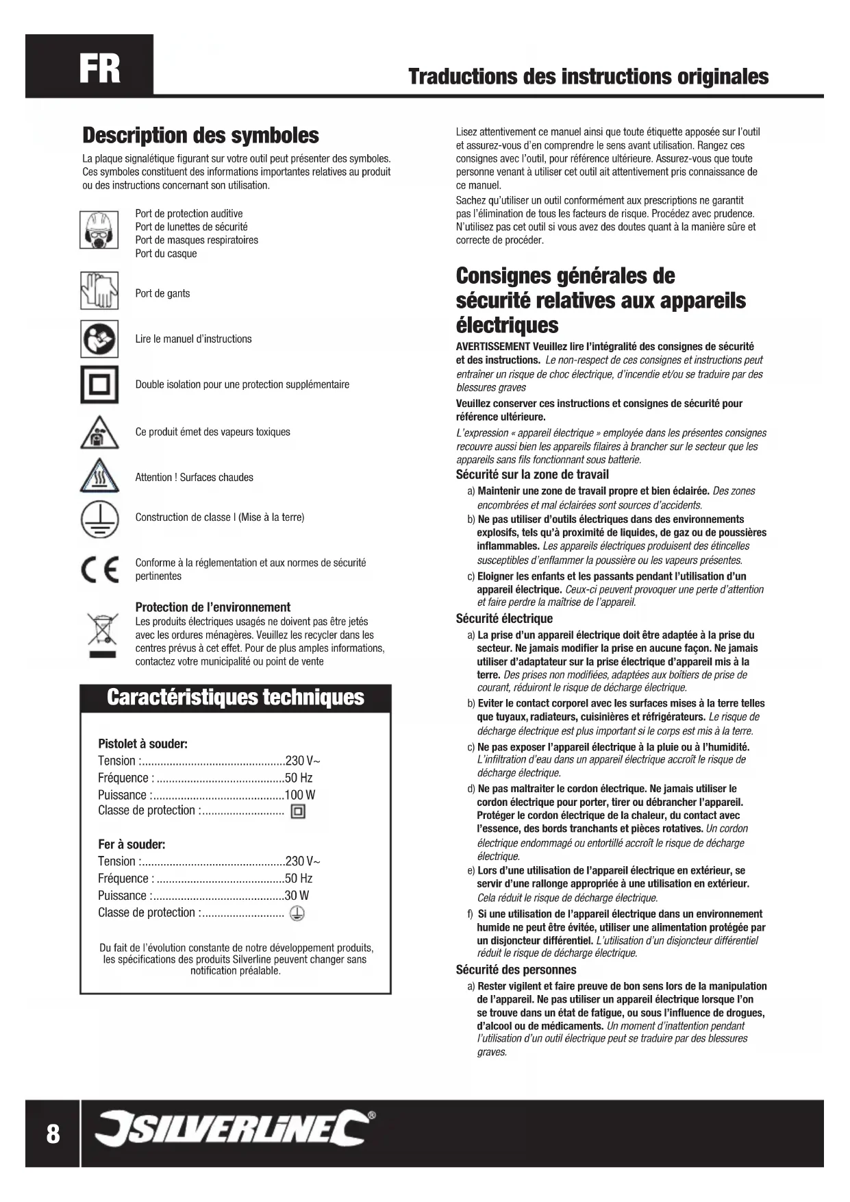 Construction de classe I (Mise à la terre) Conforme à la réglementation et aux normes de sécurité pertinentes Protection de l’environnement Les produits électriques usagés ne doivent pas être jetés avec les ordures ménagères. Veuillez les recycler dans les centres prévus à cet effet. Pour de plus amples informations, contactez votre municipalité ou point de vente Caractéristiques techniques Pistolet à souder: Tension : ...............................................230 V~ Fréquence : ..........................................50 Hz Puissance : ...........................................100 W Classe de protection : ........................... Fer à souder: Tension : ...............................................230 V~ Fréquence : ..........................................50 Hz Puissance : ...........................................30 W Classe de protection : ........................... Du fait de l’évolution constante de notre développement produits, les spécifications des produits Silverline peuvent changer sans notification préalable. Traductions des instructions originales 845318_Z1MANPRO1.indd 8 22/08/2016 15:41www.silverlinetools.com