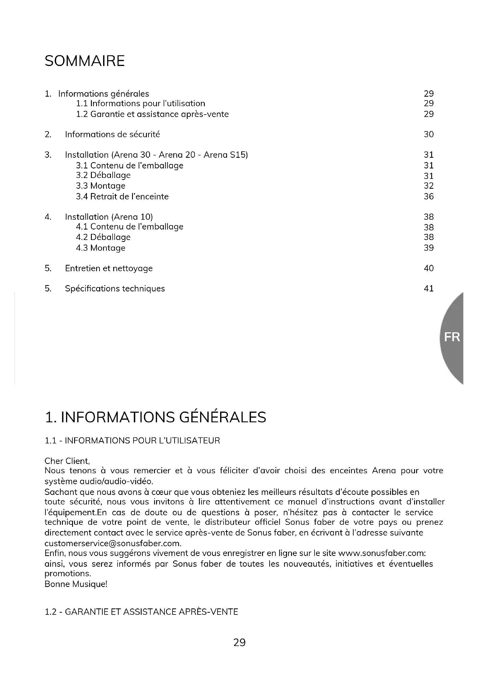 Cher Client, Nous tenons à vous remercier et à vous féliciter d’avoir choisi des enceintes Arena pour votre système audio/audio-vidéo. Sachant que nous avons à cœur que vous obteniez les meilleurs résultats d’écoute possibles en toute sécurité, nous vous invitons à lire attentivement ce manuel d’instructions avant d’installer l’équipement.En cas de doute ou de questions à poser, n’hésitez pas à contacter le service technique de votre point de vente, le distributeur ofciel Sonus faber de votre pays ou prenez directement contact avec le service après-vente de Sonus faber, en écrivant à l’adresse suivante customerservice@sonusfaber.com. Enn, nous vous suggérons vivement de vous enregistrer en ligne sur le site www.sonusfaber.com: ainsi, vous serez informés par Sonus faber de toutes les nouveautés, initiatives et éventuelles promotions. Bonne Musique!
