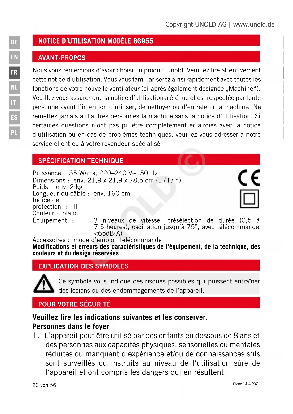 Ce symbole vous indique des risques possibles qui puissent entraîner des lésions ou des endommagements de l’appareil. AVANT-PROPOS Nous vous remercions d’avoir choisi un produit Unold. Veuillez lire attentivement cette notice d‘utilisation. Vous vous familiariserez ainsi rapidement avec toutes les fonctions de votre nouvelle ventilateur (ci-après également désignée „Machine“). Veuillez vous assurer que la notice d’utilisation a été lue et est respectée par toute personne ayant l’intention d’utiliser, de nettoyer ou d’entretenir la machine. Ne remettez jamais à d’autres personnes la machine sans la notice d’utilisation. Si certaines questions n’ont pas pu être complètement éclaircies avec la notice d‘utilisation ou en cas de problèmes techniques, veuillez vous adresser à notre service client ou à votre revendeur spécialisé. Copyright UNOLD AG | www.unold.de UNOLD ©Stand 14.4.2021 21 von 56