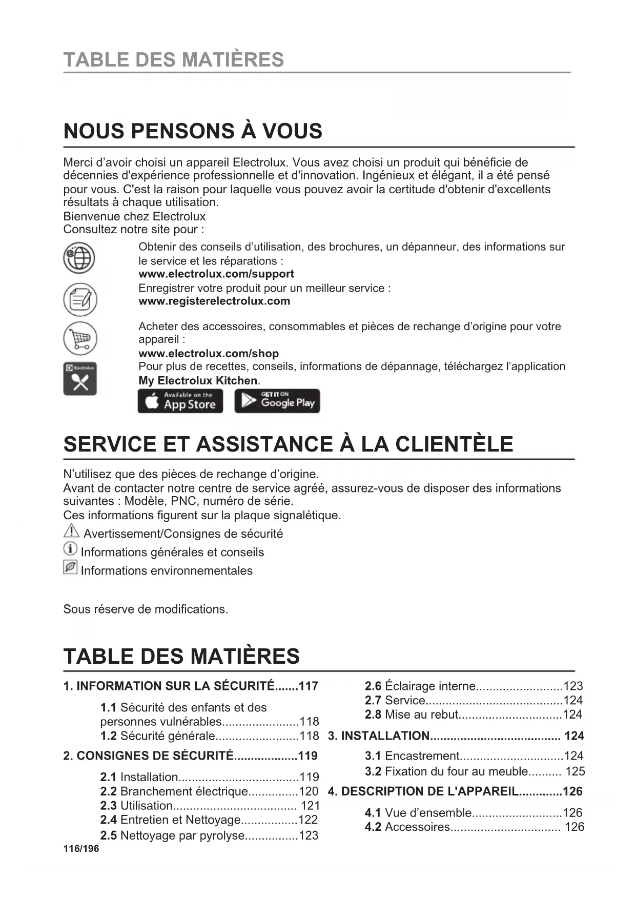 Merci d’avoir choisi un appareil Electrolux. Vous avez choisi un produit qui bénéficie de décennies d'expérience professionnelle et d'innovation. Ingénieux et élégant, il a été pensé pour vous. C'est la raison pour laquelle vous pouvez avoir la certitude d'obtenir d'excellents résultats à chaque utilisation. Bienvenue chez Electrolux Consultez notre site pour : Obtenir des conseils d’utilisation, des brochures, un dépanneur, des informations sur le service et les réparations : www.electrolux.com/support Enregistrer votre produit pour un meilleur service : www.registerelectrolux.com Acheter des accessoires, consommables et pièces de rechange d’origine pour votre appareil : www.electrolux.com/shop Pour plus de recettes, conseils, informations de dépannage, téléchargez l’application My Electrolux Kitchen.