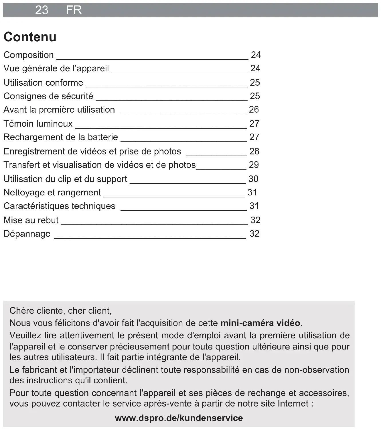 - Rangez la caméra dans un endroit sec, propre et frais, mais hors gel et hors de por- tée des enfants et des animaux. Caractéristiques techniques Référence article : 04809 Numéro de modèle : YDSXT Batterie : batterie rechargeable Li-Po ; 200 mAh ; 3,7 V cc Tension de charge : 5 V cc Interface : Micro USB Format de fi chier photo : JPG Format de fi chier vidéo : AVI Résolution vidéo : 720 p Fréquence des images : 30 fps Codage vidéo : MJPG Résolution de l’image : 1,3 Mpixels Confi guration système : Microsoft Windows XP/7/8 Durée d’enregistrement : max. 45 minutes Température de fonctionnement : 0 °C – 40 °C Carte mémoire : carte microSD, 8 Go Identifi ant mode d'emploi : Z 04809 M DS V1 1218FR 32 Mise au rebut Débarrassez-vous des matériaux d'emballage dans le respect de l'environne- ment en les déposant à un point de collecte prévu à cet effet. Cet appareil est assujetti à la directive européenne 2012/19/UE applicable aux déchets d'équipements électriques et électroniques (DEEE). L’appa- reil avec sa batterie intégrés ne doit pas être jeté avec les ordures ména- gères et doit être mis au rebut dans le respect de l’environnement par une entreprise de recyclage agréée. Dépannage Si l'appareil ne fonctionne pas correctement, examinez tout d'abord le problème pour constater si vous pouvez y remédier vous-même. Si vous ne parvenez pas à résoudre le problème selon les indications ci-après, veuillez vous adresser au service après-vente. N'essayez pas de réparer vous-même un appareil électrique ! Problème Cause possible Solution La caméra (1) n’enregistre pas. La batterie est vide. Rechargez la batterie. La caméra est en mode photo. Paramétrez le mode vidéo. La carte mémoire (6) n'est pas (correctement) en place. Insérez la carte mémoire ou ex- trayez-la et remettez-la en place dans la fente (8). Elle doit s'enclencher. La carte mémoire est pleine. Supprimez des fi chiers de la carte mé- moire (voir paragraphe « Transfert et visualisation de vidéos et de photos »). La carte mémoire est endom- magée. Utilisez une carte mémoire neuve. Tenez-la éloignée des aimants et des champs magnétiques. La batterie ne se recharge pas. Le câble USB (4) n’est pas correctement raccordé. Corrigez le branchement. Chargement sur un ordina- teur : l'ordinateur est éteint. Déconnectez le câble USB, allumez l’ordinateur et reconnectez le câble. Chargement sur une prise : la prise est défectueuse. Essayez le branchement sur une autre prise. Chargement sur une prise : l’adaptateur secteur USB est défectueux. Essayez le branchement sur un autre adaptateur secteur USB. Chargement sur une prise : il n’y a pas de tension secteur. Contrôlez le fusible au tableau élec- trique (boîte à fusibles). Tous droits réservés.33 NL Inhoud Leveringsomvang _________________________________ 34 Apparaatoverzicht _________________________________ 34 Doelmatig gebruik _________________________________ 34 Veiligheidsaanwijzingen _____________________________ 35 Vóór het eerste gebruik _____________________________ 36 Controlelampje ___________________________________ 36 Accu opladen _____________________________________ 37 Video- en foto-opnamen ____________________________ 38 Video- en foto-opnamen overzetten en bekijken __________ 39 Clip en houder gebruiken ___________________________ 40 Reinigen en opbergen ______________________________ 41 Technische gegevens ______________________________ 41 Afvoeren ________________________________________ 41 Storingen verhelpen _______________________________ 42 Uitleg van de symbolen Gevaarsymbolen: deze symbolen wijzen op gevaar voor letsel (bijv. door stroom of vuur). Lees de bijbehorende veiligheidsaanwij- zingen aandachtig door en volg ze op. Aanvullende informatie Uitleg van de signaalwoorden GEVAAR waarschuwt voor ernstig letsel en levensgevaar WAARSCHUWING waarschuwt voor mogelijk ernstig letsel en levensgevaar VOORZICHTIG waarschuwt voor licht tot gemiddeld letsel LET OP waarschuwt voor materiële schade Geachte klant, Wij danken u dat u hebt gekozen voor de aankoop van deze mini-videocamera. Lees vóór het eerste gebruik van het apparaat deze gebruikershandleiding zorgvuldig door en bewaar deze voor latere vragen en andere gebruikers. Deze is een bestand- deel van het apparaat. Fabrikant en importeur aanvaarden geen aansprakelijkheid wanneer de informatie in deze gebruikershandleiding niet in acht wordt genomen. Neem bij vragen over het apparaat en over reserveonderdelen / toebehoren via onze website contact op met de klantenservice: www.dspro.de/kundenserviceNL 34 Leveringsomvang (Afbeelding zie voorste uitklappagina) 1 Camera (1 x) 2 Clip (1 x) 3 Houder (1 x) 4 USB-kabel (A-stekker aan micro-B-stekker) (1 x) 5 Kleefstrip (1 x) 6 microSD-geheugenkaart, 8 GB (1 x) Niet afgebeeld: Schroeven (2 x) en pluggen (2 x), gebruikershandleiding (1 x) Voor het opladen in de contactdoos wordt bovendien nog een USB-netadapter benodigd. Apparaatoverzicht (Afbeelding zie voorste uitklappagina) 7 Micro-USB-bus 8 Sleuf van de microSD-geheugenkaart 9 Groef voor het aanbrengen van de clip 10 Lens 11 Infrarood-LED’s (zenden geen zichtbaar licht uit) 12 Microfoon (in de behuizing) 13 Opname-knop (aan- / uitschakelen, opnamen starten, wisselen tussen foto en video) 14 Controlelampje 15 Bovenkant Doelmatig gebruik