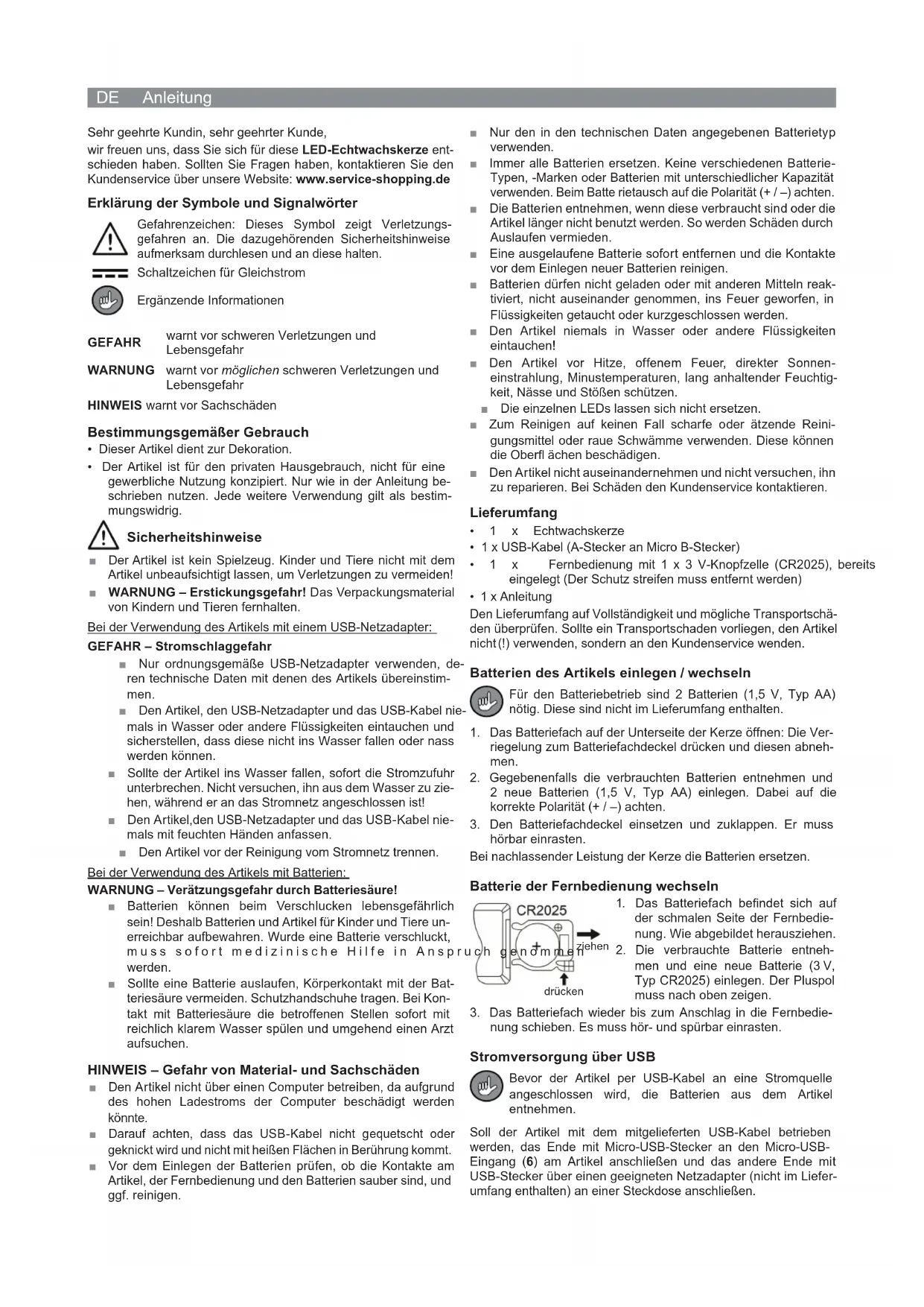 Article number: 04817 Z 04817 M DS V1 0518FR Mode d'emploi Chère cliente, cher client, Nous vous félicitons d'avoir fait l'acquisition de cette bougie en cire à DEL. Pour toute question, veuillez contacter le service après- vente depuis notre site Internet : www.service-shopping.de Explication des symboles / mentions d'avertissement Mention de danger : ce symbole indique les risques de blessures. Lisez et observez attentivement les consignes de sécurité correspondantes. Symbole du courant continu Informations complémentaires DANGER Vous alerte devant le risque de blessures graves et mortelles AVERTISSEMENT Vous alerte devant le risque potentiel de blessures graves ou mortelles AVIS Vous alerte devant le risque de dégâts matériels Utilisation conforme
