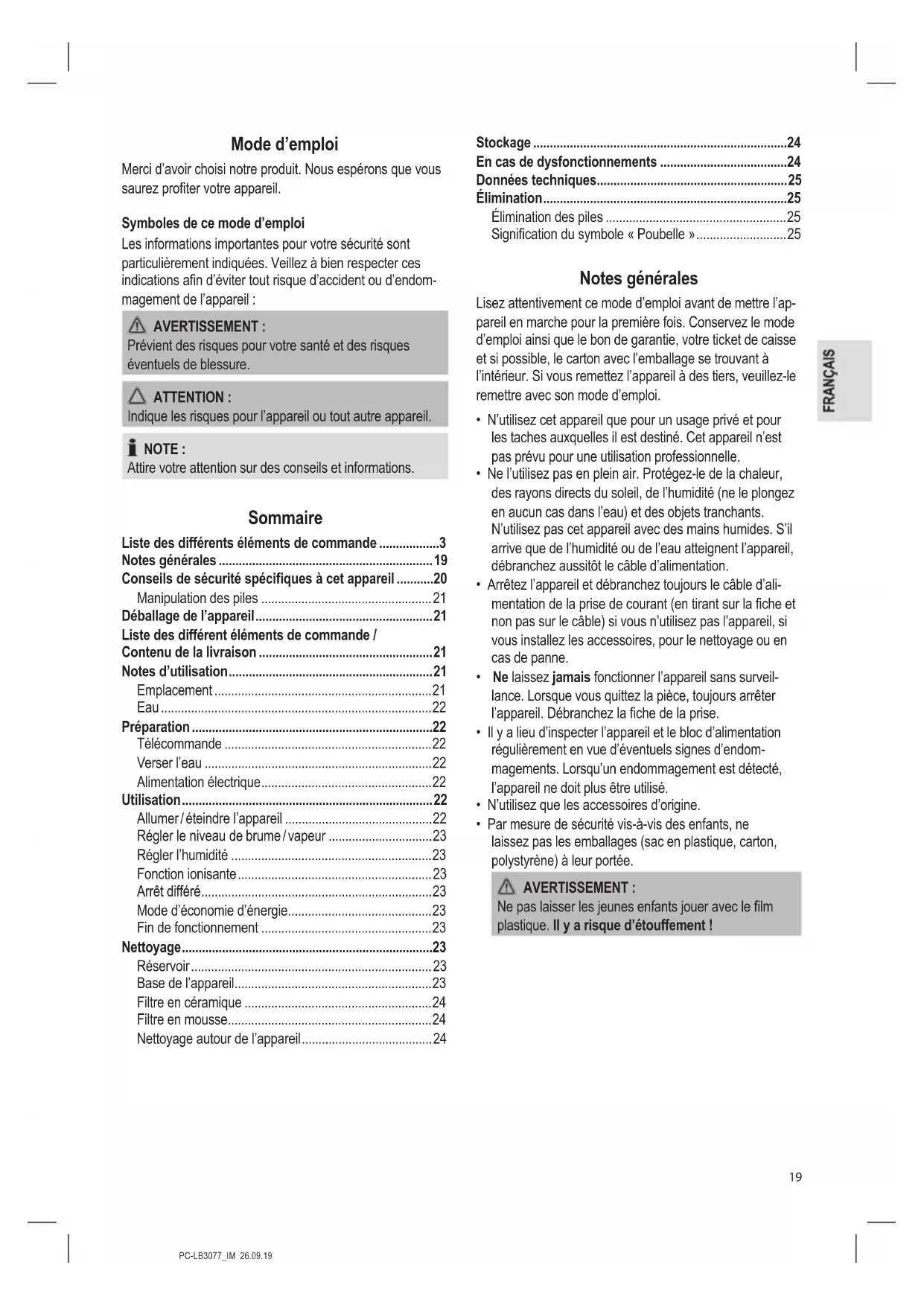Données techniques Modèle : ..............................................................PC-LB 3077 Alimentation : .....................................220 - 240 V~, 50 - 60 Hz Consommation : .............................................................. 25 W Classe de protection : .......................................................... Capacité : ..............................................................env. 5 litres Poids net : ............................................................env. 1,47 kg Nous nous réservons le droit d’apporter des modications techniques ainsi que des modications de conception dans le cadre du développement continu de nos produits. Cet appareil est conforme à toutes les directives CE en vigueur, telles que les directives sur la compatibilité électro- magnétique et les faibles tensions et a été fabriqué selon les derniers règlements de sécurité. Élimination Élimination des piles En tant que consommateur, vous êtes tenu de rapporter les piles / accumulateurs usagés. Retirez la pile de la télécommande avant de jeter l’appareil. Rapportez la pile à un point de collecte qui rassemble les piles usagées ou les déchets dangereux. Contactez votre autorité locale pour plus d’informations. Signication du symbole « Poubelle » Protégez votre environnement, ne jetez pas vos appareils électriques avec les ordures ménagères. Utilisez, pour l’élimination de vos appareils électriques, les bornes de collecte prévues à cet effet où vous pouvez vous débarrasser des appareils que vous n’utilisez plus. Vous contribuez ainsi à éviter les impacts potentiels dans l’environnement et sur la santé de chacun, causés par une mauvaise élimination de ces déchets. Vous contribuez aussi au recyclage sous toutes ses formes des appareils électriques et électroniques usagés. Vous trouverez toutes les informations sur les bornes d’élimination des appareils auprès de votre commune ou de l’administration de votre communauté.PC-LB3077_IM 26.09.19