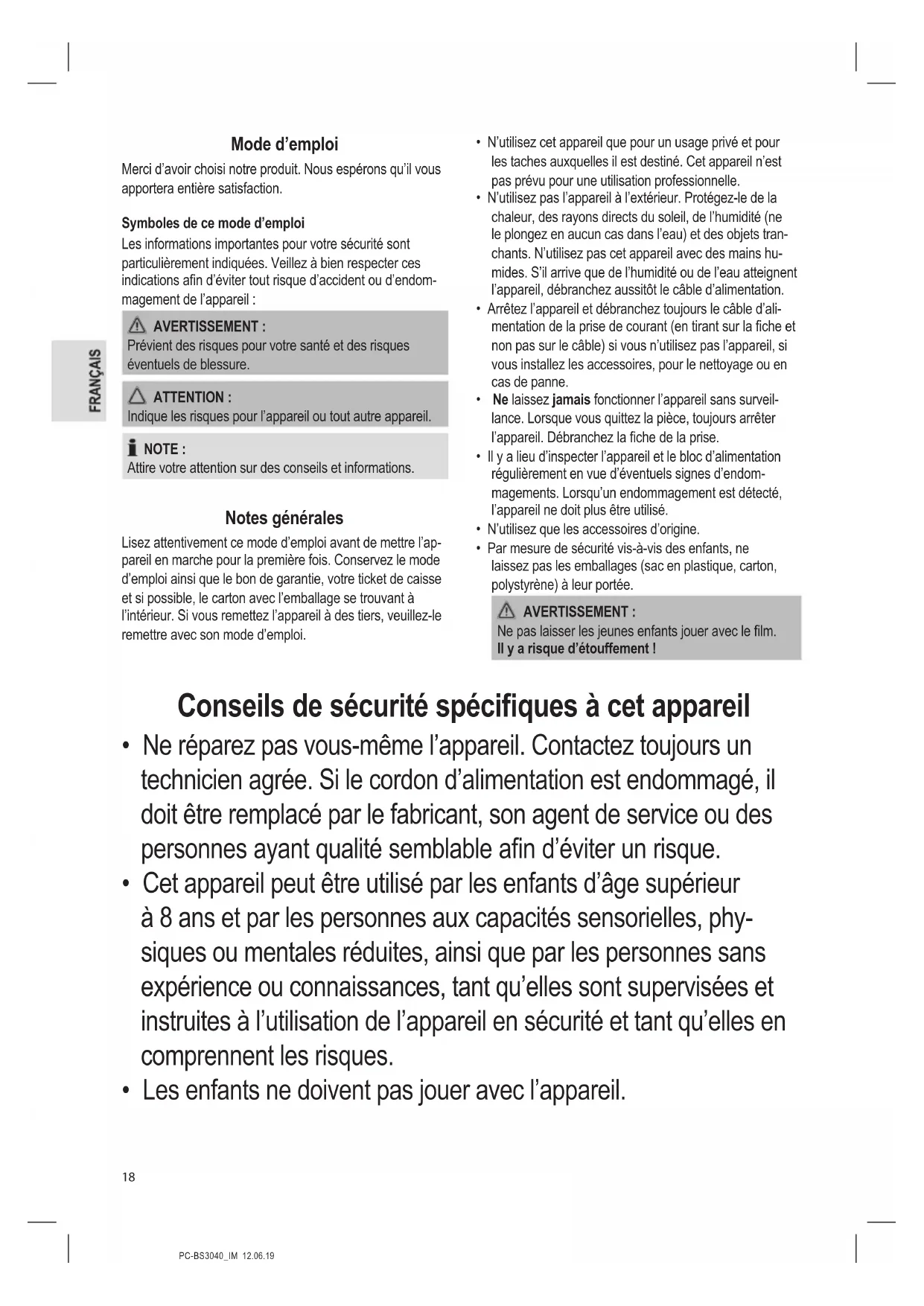 - Les enfants ne doivent pas jouer avec l’appareil.PC-BS3040_IM 12.06.19