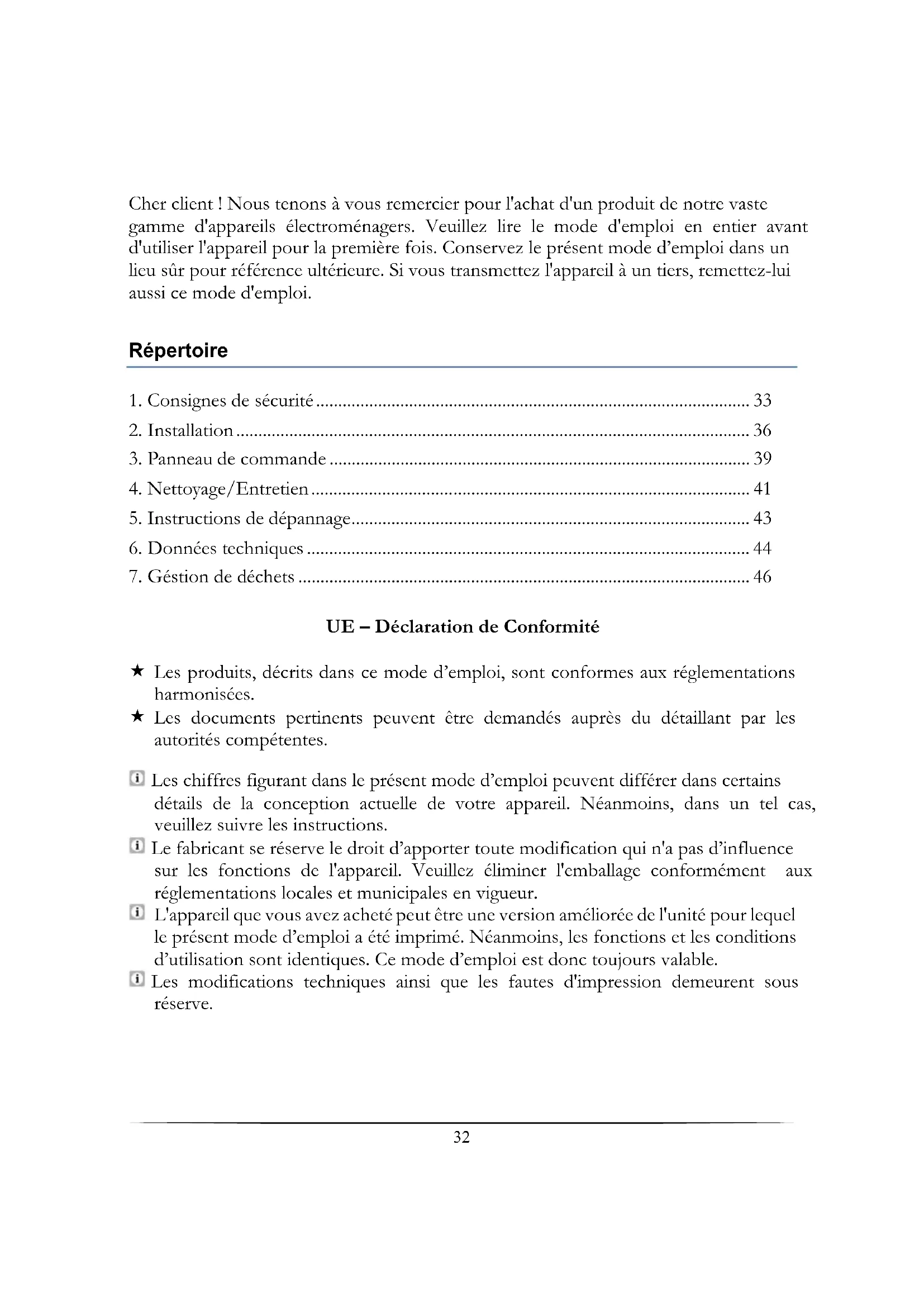 - 7. Géstion de déchets UE – Déclaration de Conformité Les produits, décrits dans ce mode d’emploi, sont conformes aux réglementations harmonisées. Les documents pertinents peuvent être demandés auprès du détaillant par les autorités compétentes. Les chiffres figurant dans le présent mode d’emploi peuvent différer dans certains détails de la conception actuelle de votre appareil. Néanmoins, dans un tel cas, veuillez suivre les instructions. Le fabricant se réserve le droit d’apporter toute modification qui n'a pas d’influence sur les fonctions de l'appareil. Veuillez éliminer l'emballage conformément aux réglementations locales et municipales en vigueur. L'appareil que vous avez acheté peut être une version améliorée de l'unité pour lequel le présent mode d’emploi a été imprimé. Néanmoins, les fonctions et les conditions d’utilisation sont identiques. Ce mode d’emploi est donc toujours valable. Les modifications techniques ainsi que les fautes d'impression demeurent sous réserve.33 p. 46