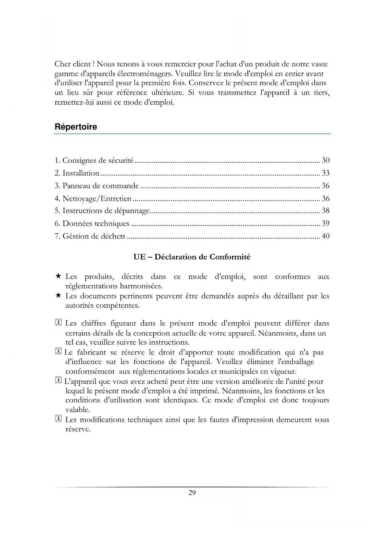 - Januar 201729 Cher client ! Nous tenons à vous remercier pour l'achat d'un produit de notre vaste gamme d'appareils électroménagers. Veuillez lire le mode d'emploi en entier avant d'utiliser l'appareil pour la première fois. Conservez le présent mode d’emploi dans un lieu sûr pour référence ultérieure. Si vous transmettez l'appareil à un tiers, remettez-lui aussi ce mode d'emploi. Répertoire 1. Consignes de sécurité p. 30